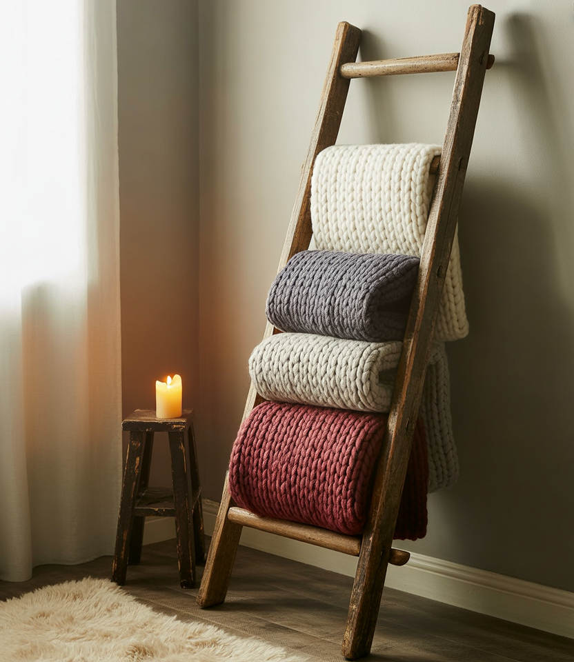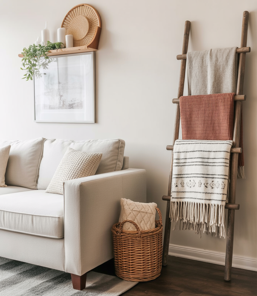 A wooden blanket ladder against the wall fits both practical and pretty purposes. Perfect for small spaces or the home rustic interiors, it turns storage into décor. Many recommend this for the home diysince ladders are simple to build. It adds a tactile layer to living room warmth.