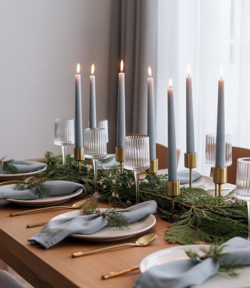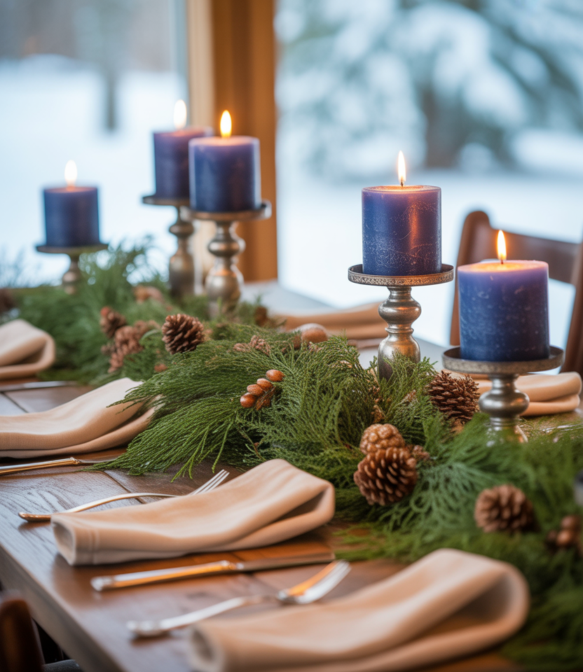 Even afterChristmas, winter tables deserve festive reminders in some form. Use sprigs of evergreen tied with linen napkins orbluecandles on the runner. My sister hosts dinners inJanuarywith just these few hints, and it is both refined and familiar. It is keeping some of the holiday warmth alive.