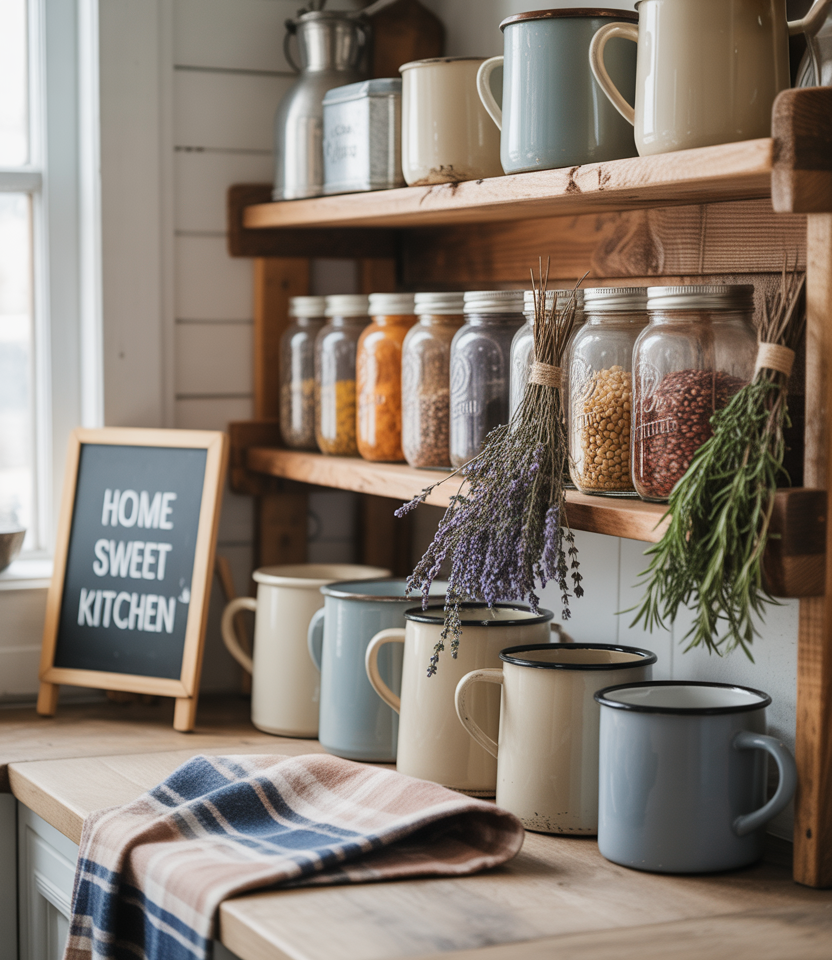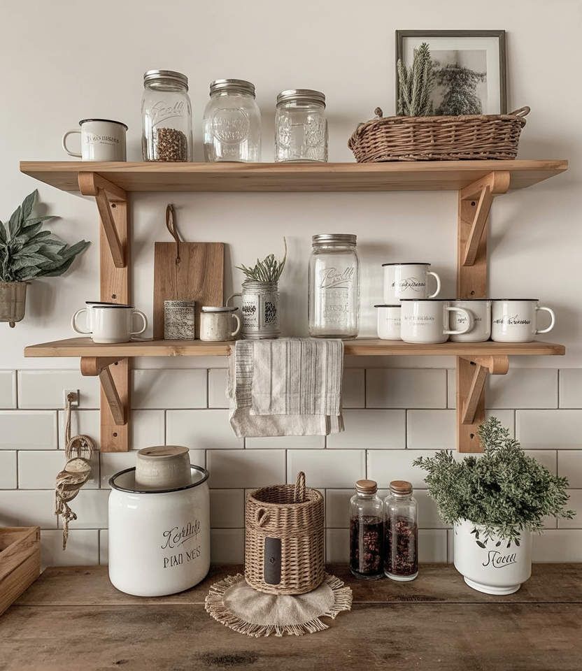 Open shelves in thekitchenallowrustic farmhousestyling. Think mason jars, enamel mugs, and dried herbs in bundles. It’s functional but also decorative. Growing up, my mother’s shelves always changed seasonally, and winter meant cinnamon sticks and cocoa mixes on display.