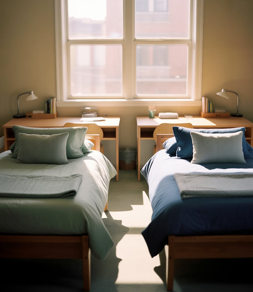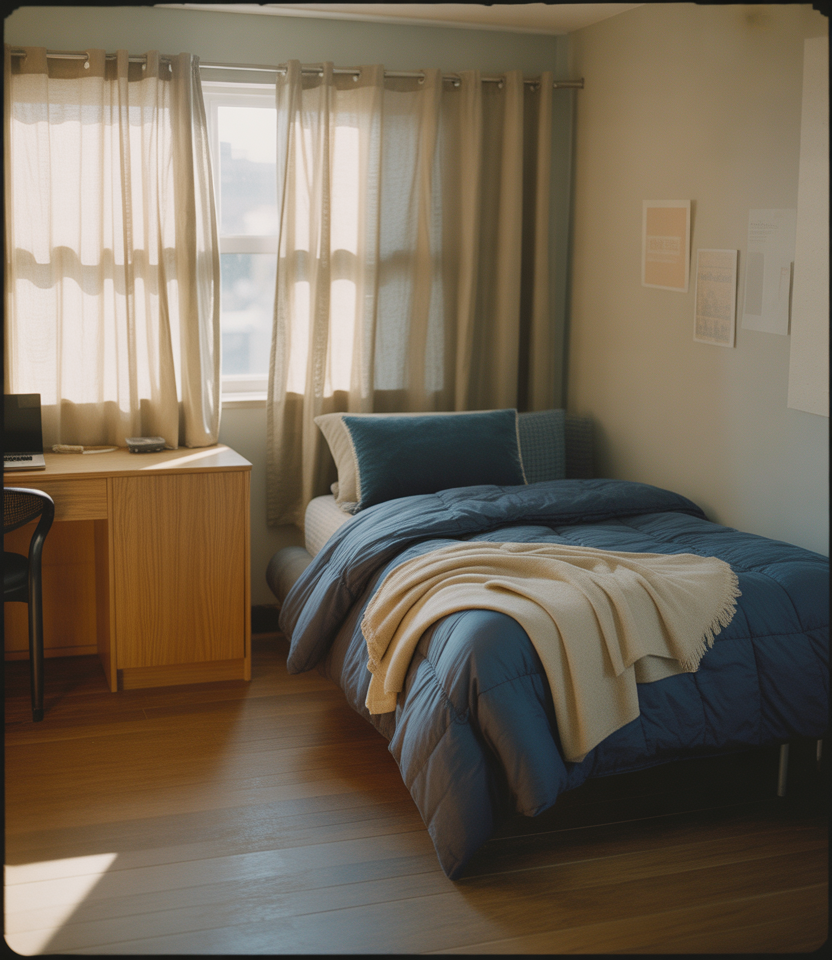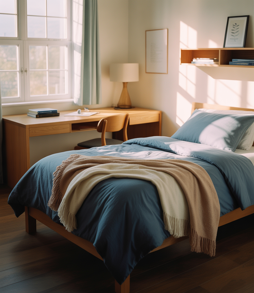This idea is designed for a freshman stepping into dorm life for the first time, blending cozy comfort with a calming cozy blue palette. Soft blue bedding, layered neutrals, and simple textures create a welcoming atmosphere that feels safe and familiar. The look avoids visual clutter while still feeling personal, making it ideal for small shared rooms where balance matters.