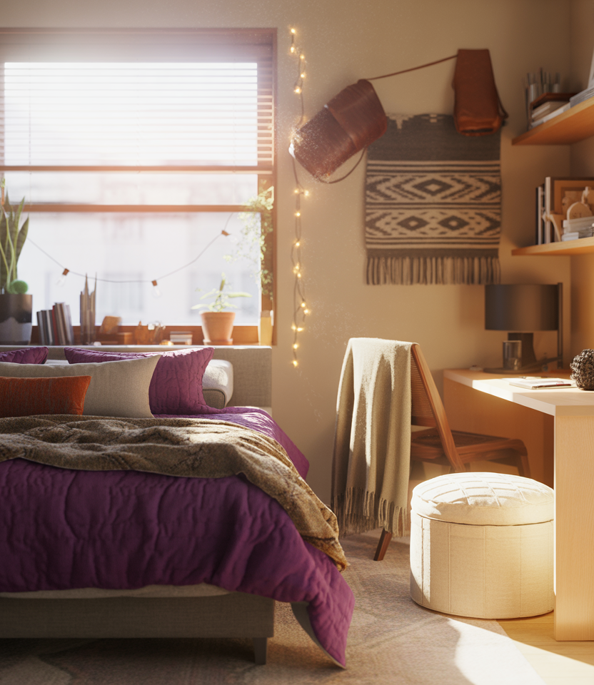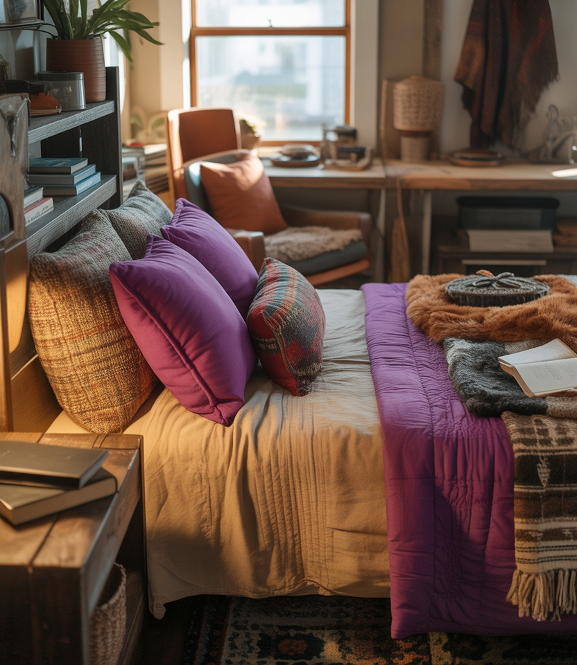 This unique take blends purple accents with subtle Western influences like textured throws and warm neutrals. It feels creative and slightly unconventional, offering a sense of individuality that resonates with students who want their dorm to feel personal.