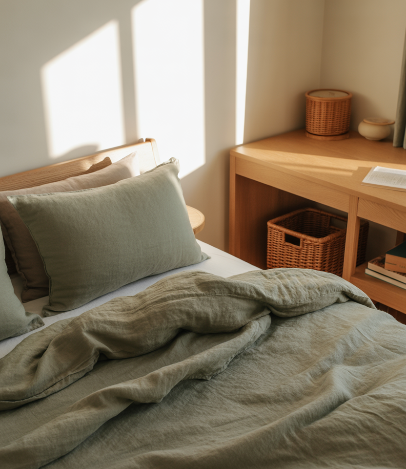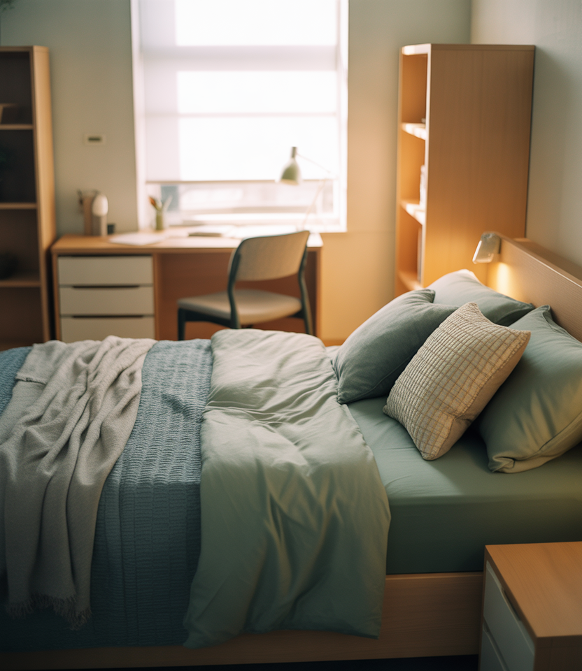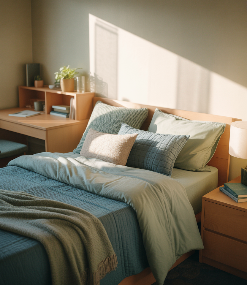 This final idea blends green and blue hues into a soft, cozy dorm that feels balanced and restorative. Muted tones, layered bedding, and simple furniture help the space feel cohesive, making it easy to relax or focus depending on the moment.