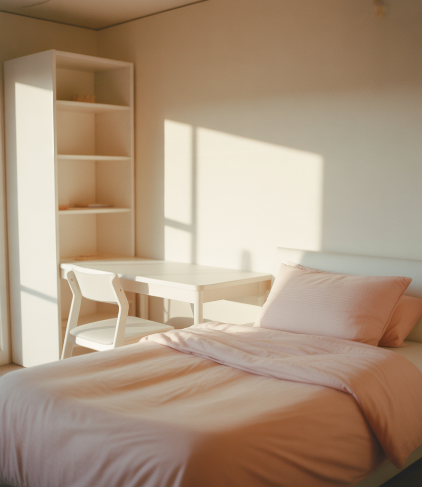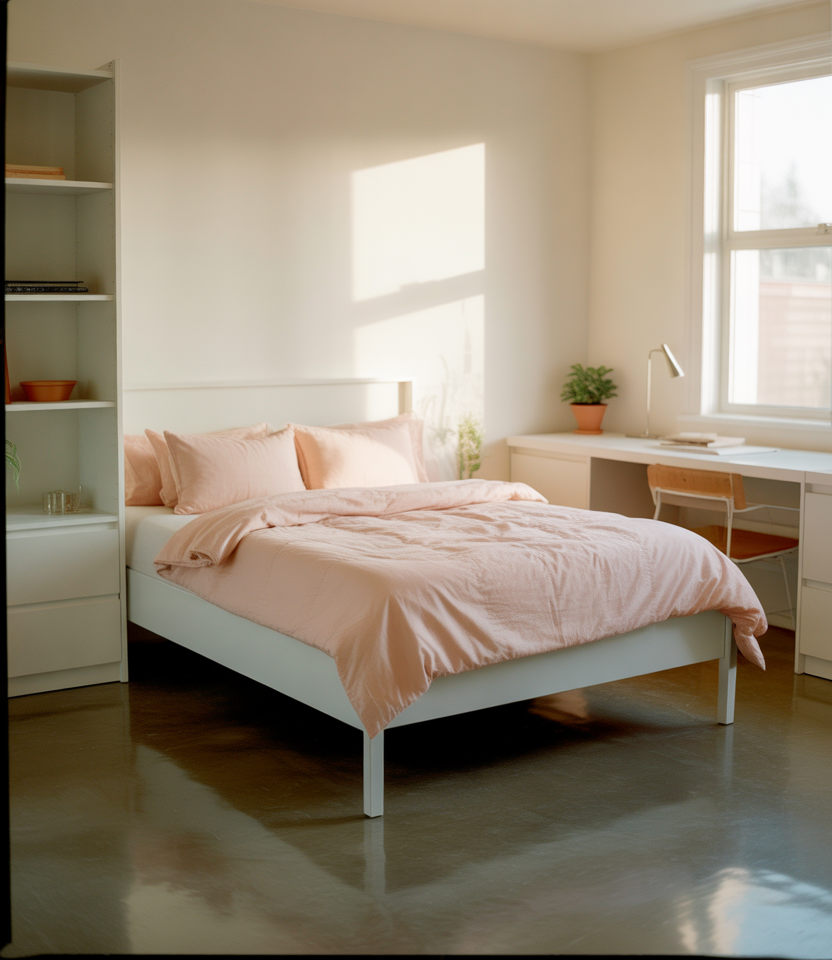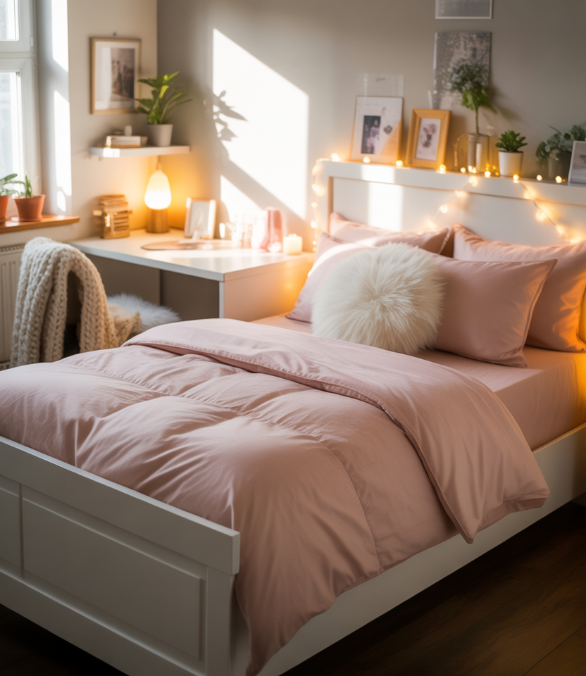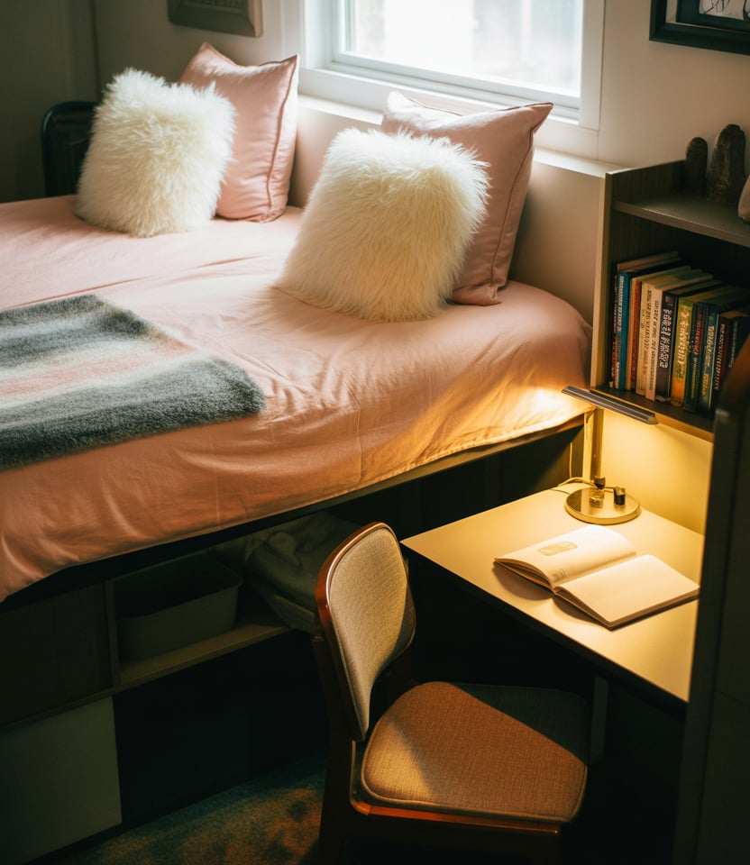 This setup leans into pink tones while keeping things tasteful and soft, resulting in a cute yet grown-up dorm room. Blush bedding, subtle metallic accents, and warm lighting make the space feel cheerful without overwhelming the senses. It’s playful but still polished.