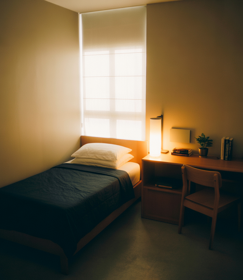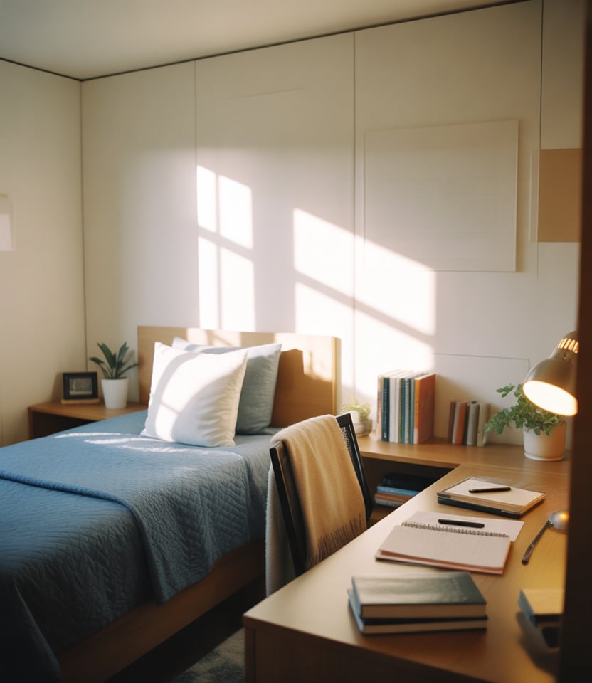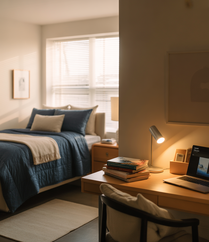 This setup leans into cozy blue tones while keeping the layout study-friendly. Calm colors, simple furniture, and layered lighting help the dorm feel productive without becoming sterile. It’s a smart blend of comfort and concentration.