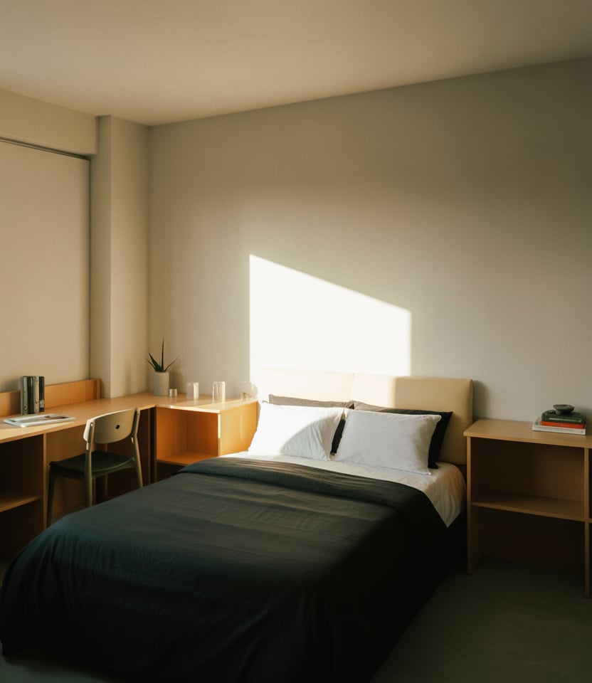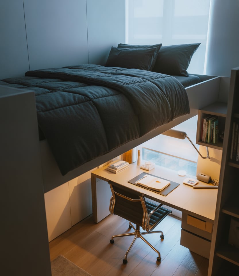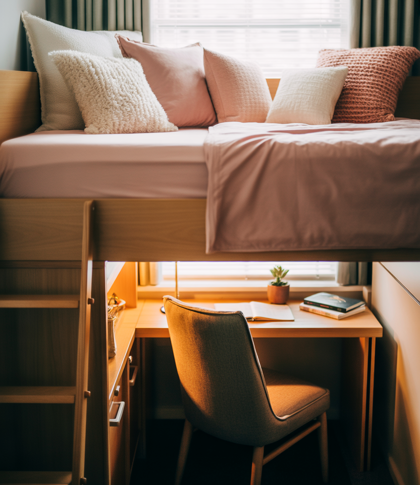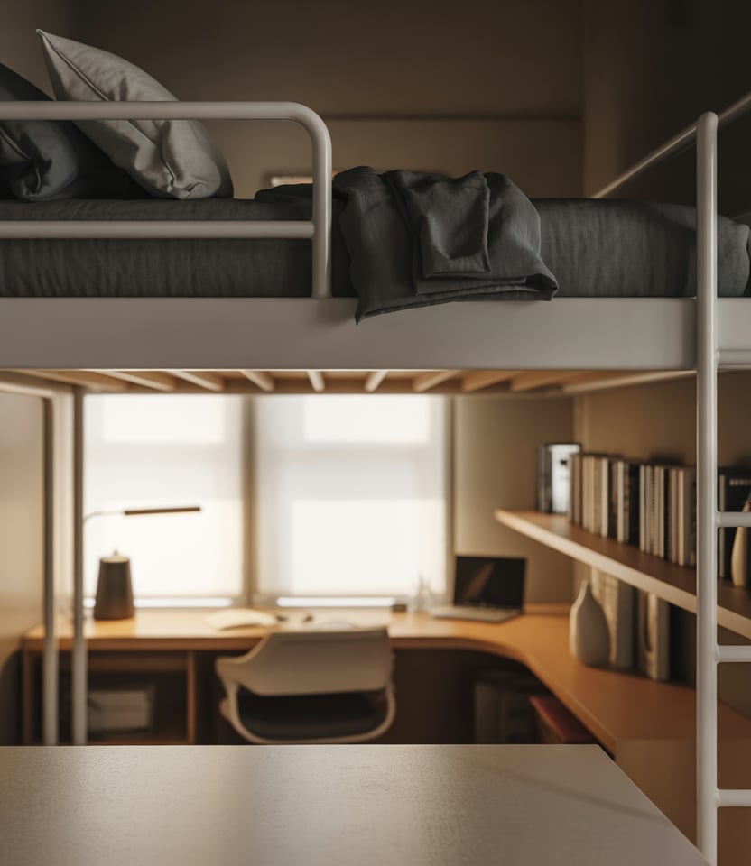 Using lofted beds to free up floor space allows room for a casual lounge area below. This design prioritizes flexibility, turning a tight dorm into a place for studying, relaxing, and hosting friends. Clean lines keep the layout from feeling overcrowded.