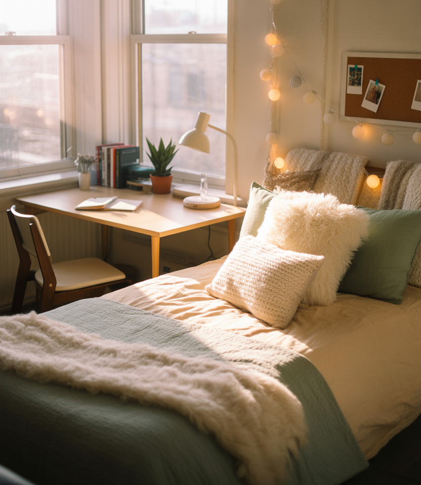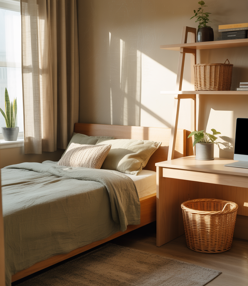This look blends earthy elements with a refined green palette to create a dorm that feels grounded and uncluttered. Natural textures, muted fabrics, and restrained decor help the space feel calm even during high-stress academic weeks. It’s minimal but never cold.