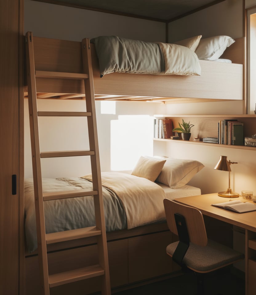 Combining cozy pink tones with lofted beds creates a layered, vertical design that feels both playful and practical. Soft pink textiles warm up the structure of the loft, while the underneath space becomes a functional lounge or study area.