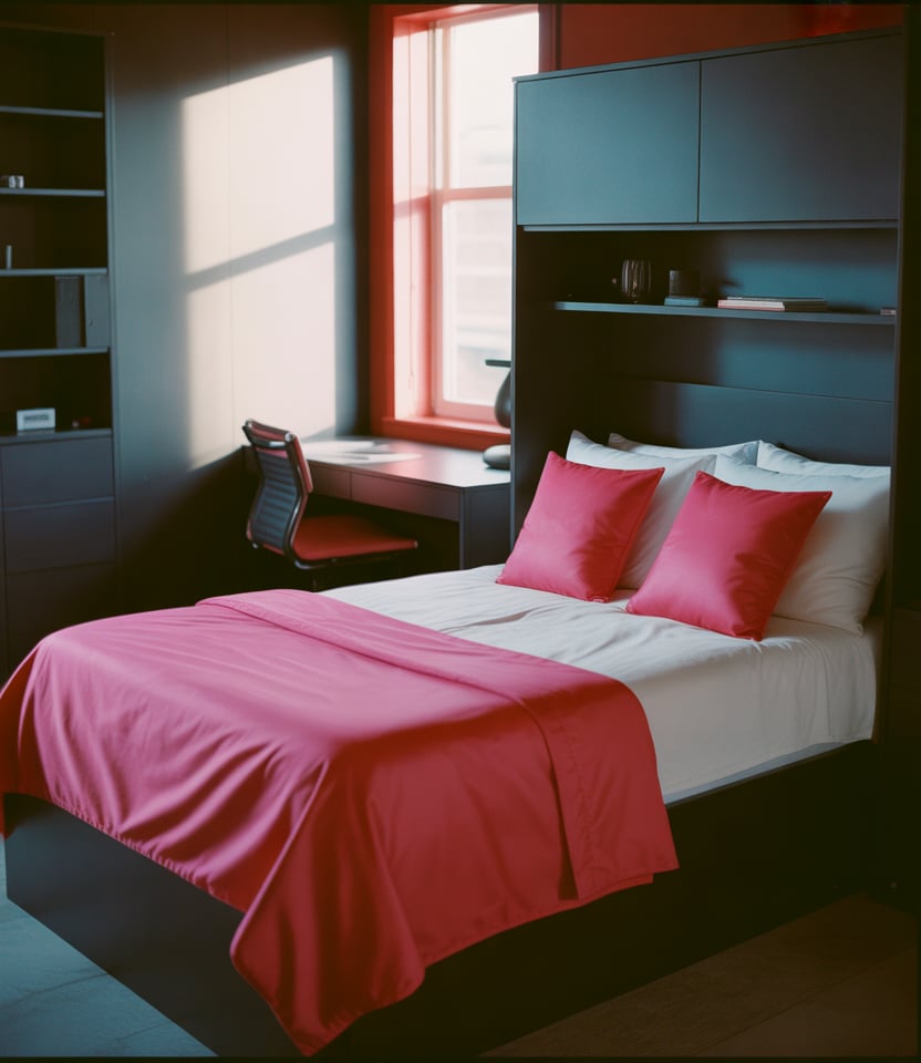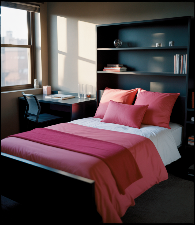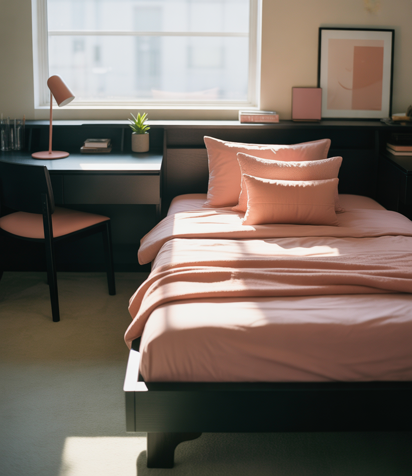 This dorm idea pairs black and pink for a confident, modern contrast that feels expressive yet controlled. Dark foundations keep the space grounded, while pink accents add personality and softness.