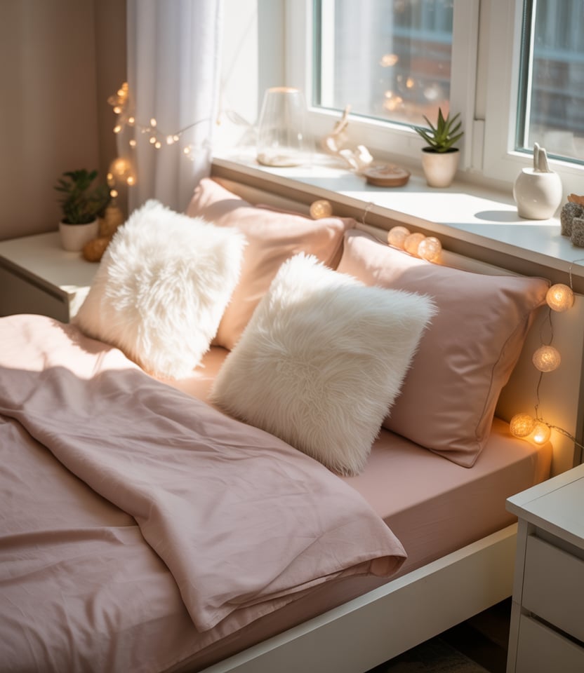 This room pairs pink accents with clean whites for a light, aesthetic look that feels fresh rather than childish. The balance keeps the space bright while still allowing personality to shine through textiles and small decor pieces.