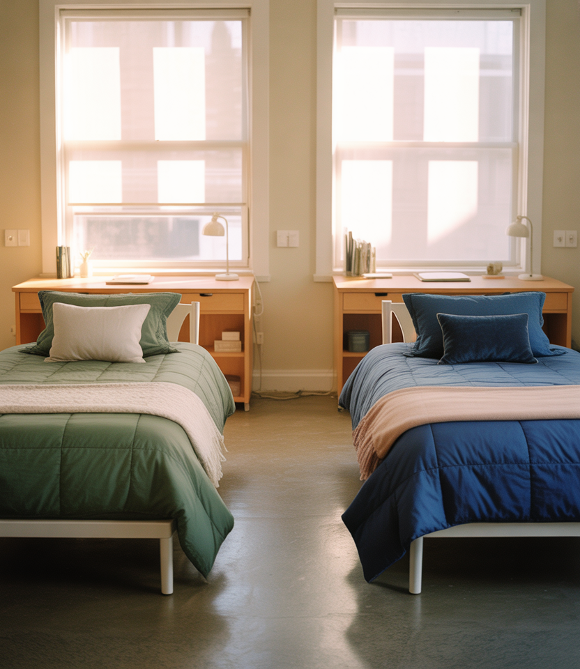 Integrating green and blue presents a poetic color palette that is both soothing and dynamic. The contrast keeps the dorm visually understimulating yet interesting. This color palette is particularly suitable for shared dorms.