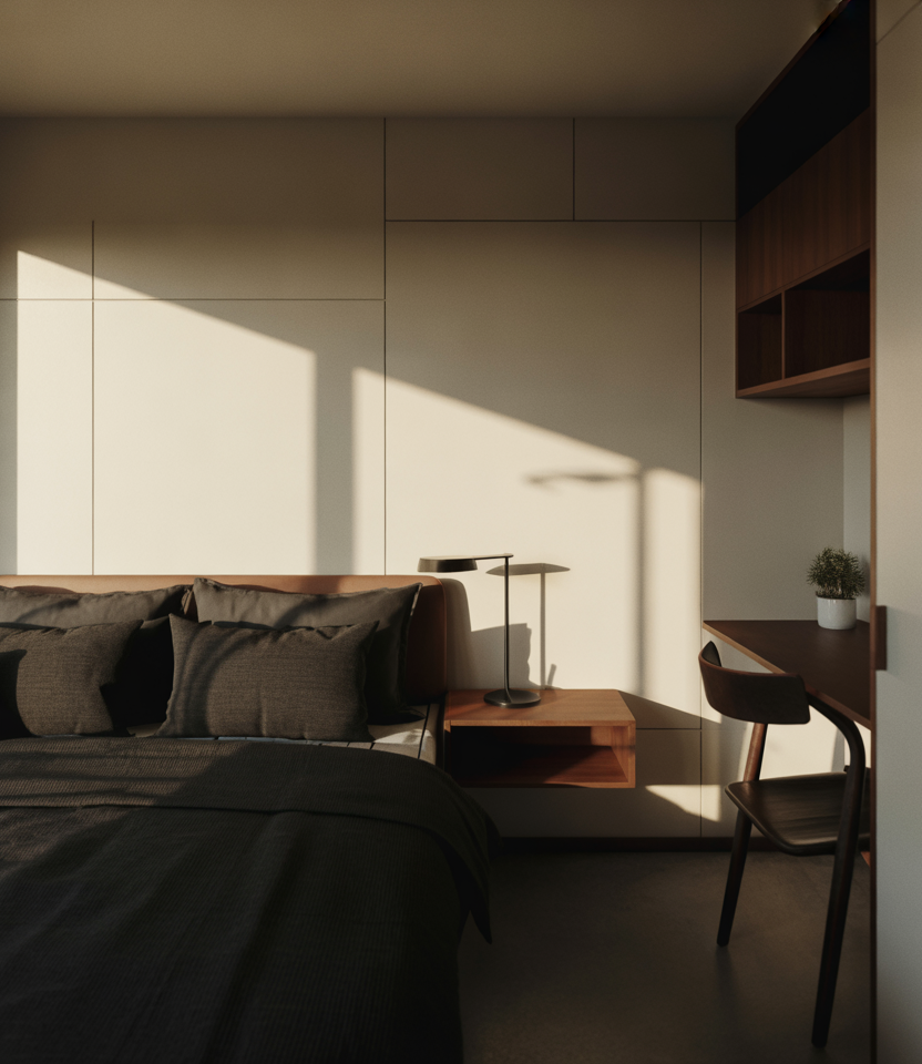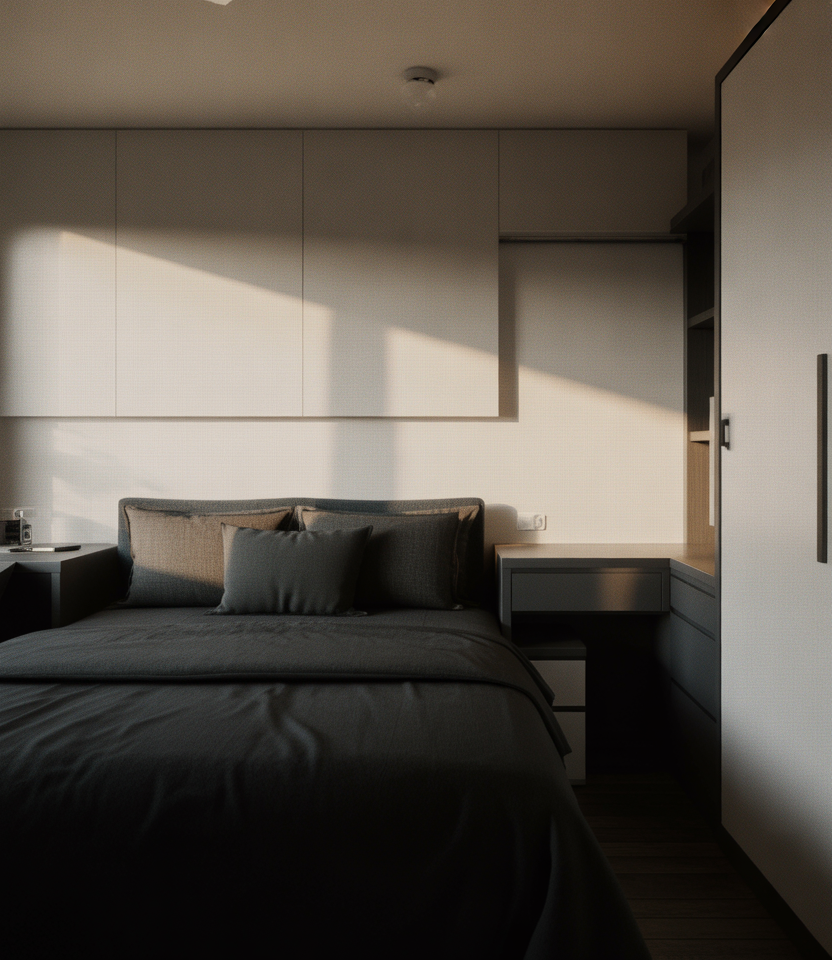 This concept embraces Black tones and a minimalist dark aesthetic approach that feels sophisticated rather than heavy. Dark bedding, matte finishes, and restrained decor give the room a mature, urban feel that appeals to students who prefer simplicity over clutter.