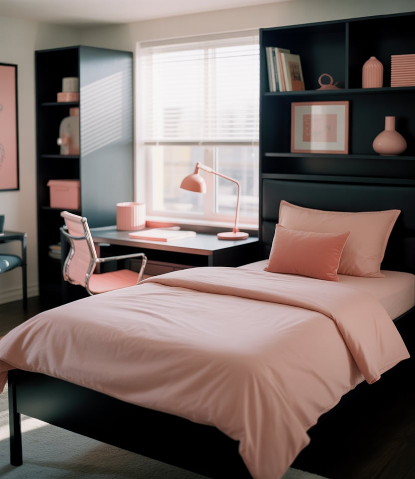 Mixing black and pink creates contrast that feels bold yet balanced. Dark furniture grounds the space, while pink accents add personality and softness. The result is expressive without feeling chaotic, ideal for students who want their dorm to stand out.