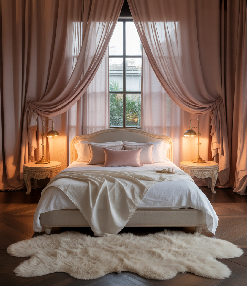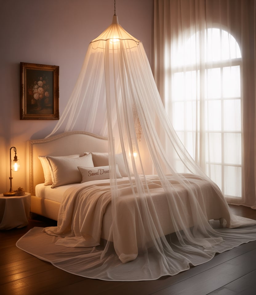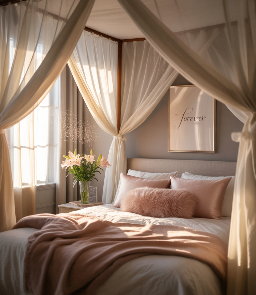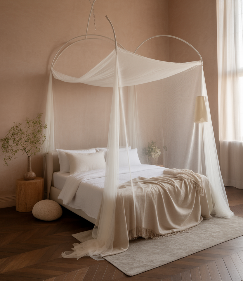 Soft netting over the bed gives a dreamy, protective canopy feel to date night or Valentine’s nights. Let it hang loosely to evoke softness without ceiling anchors. This is common over mosquito nets in Bali resorts but also works as romantic decor.