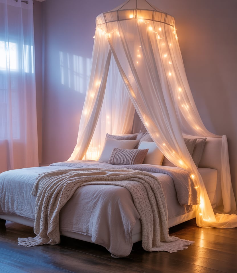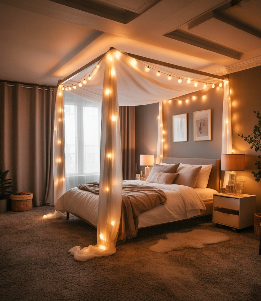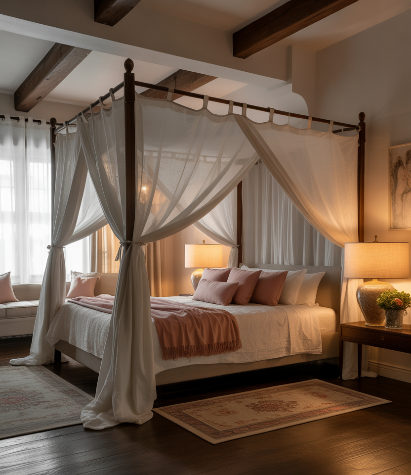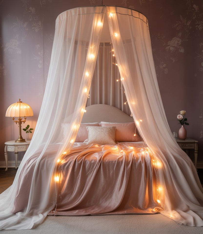 Soft netting over the bed gives a dreamy, protective canopy feel to date night or Valentine’s nights. Let it hang loosely to evoke softness without ceiling anchors. This is common over mosquito nets in Bali resorts but also works as romantic decor.