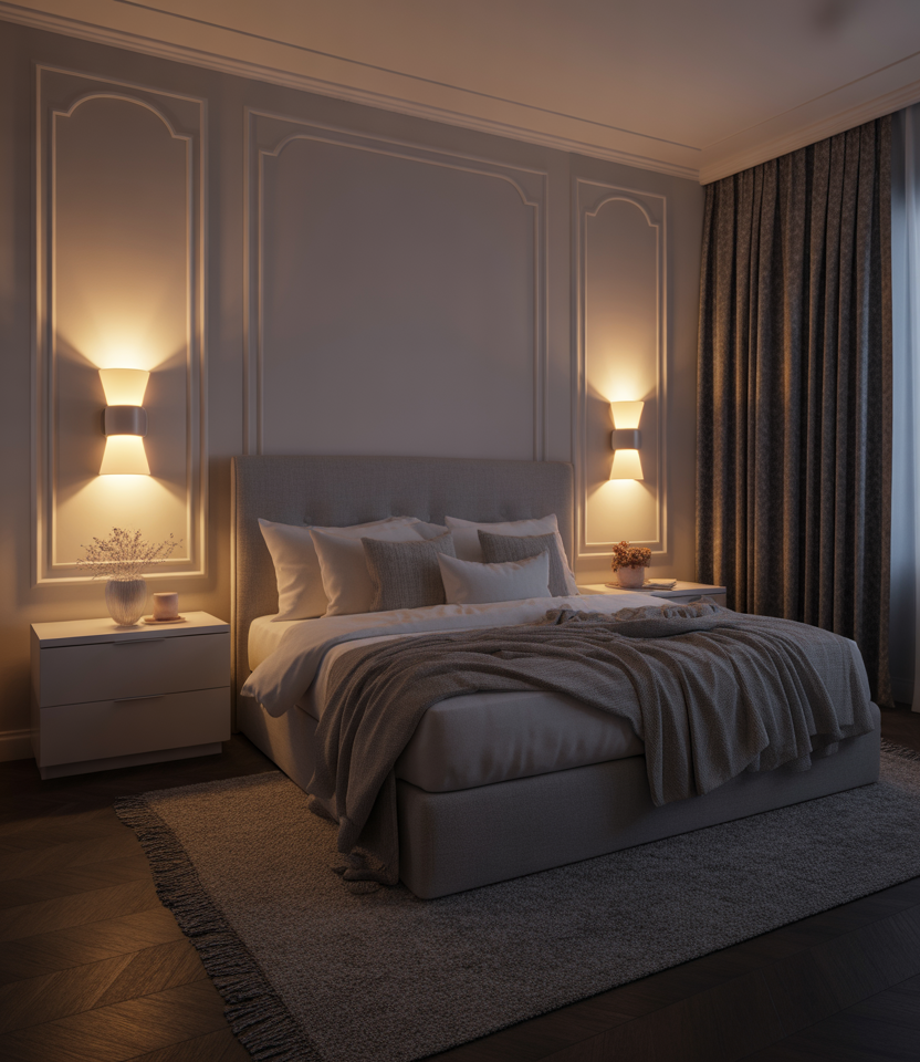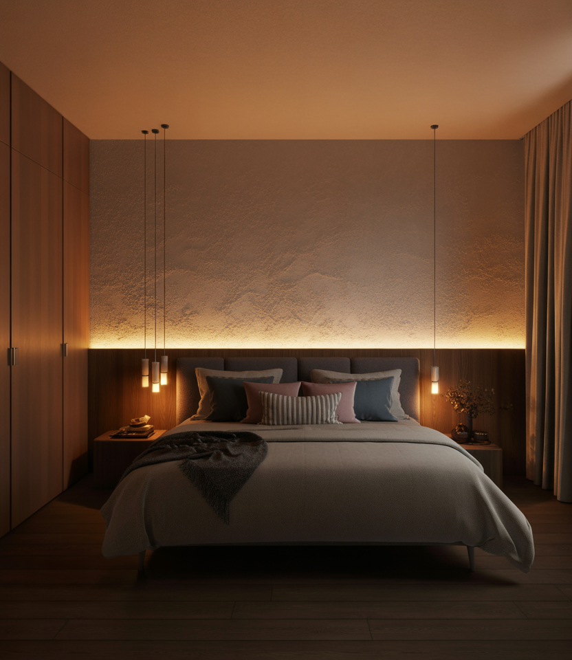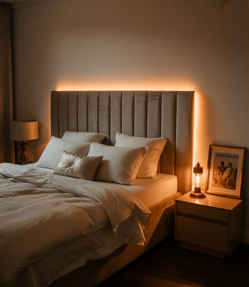 Build-in lighting ideas with hidden LED cove strips behind the headboards or crown molding provide warm ambient glow for couples’ date or love evenings. Use the warm color temp(~2700 K). An interior designer from Architectural Digest recommended cove lighting for intimate demarcation of space.