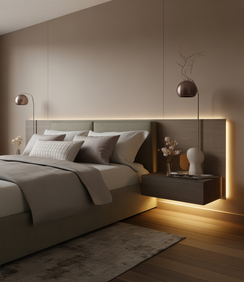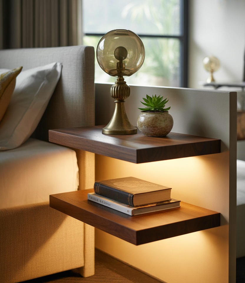 Replace bulky nightstands with floating shelves integrated with under-shelf lighting, keeping the floor less cluttered as well as soft optics for couples’ love or couples’ date nights. Sponsored by Dwell, a designer praised this for creating visual lightness.