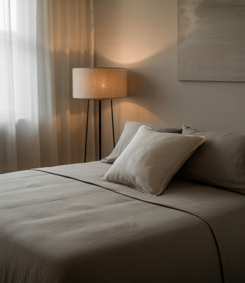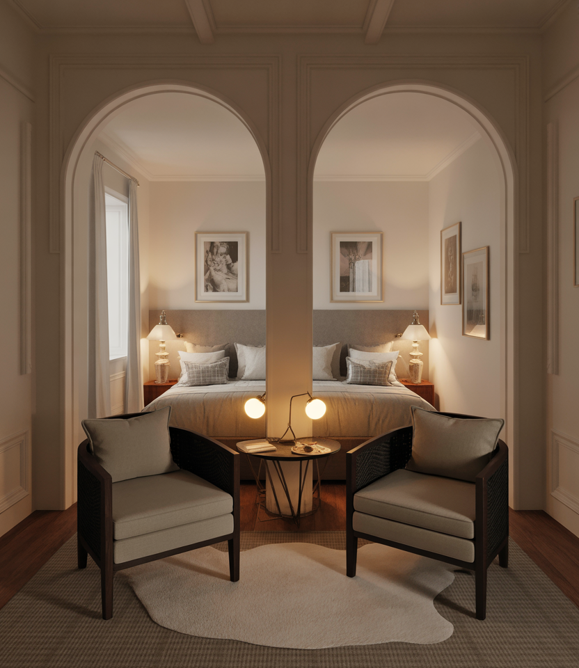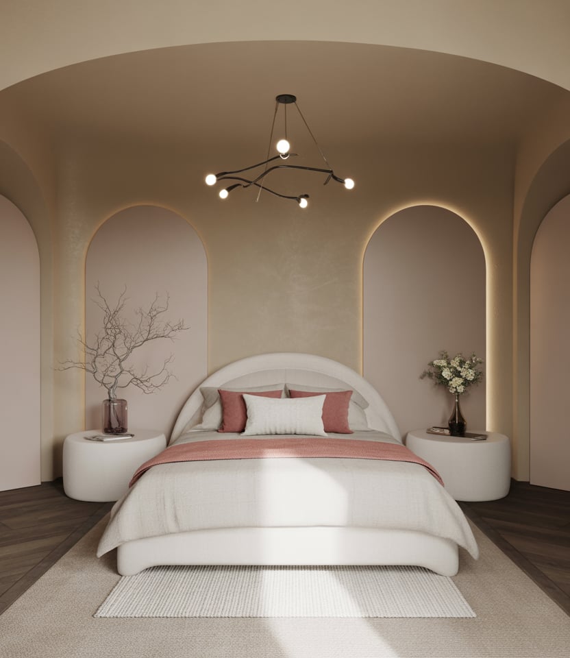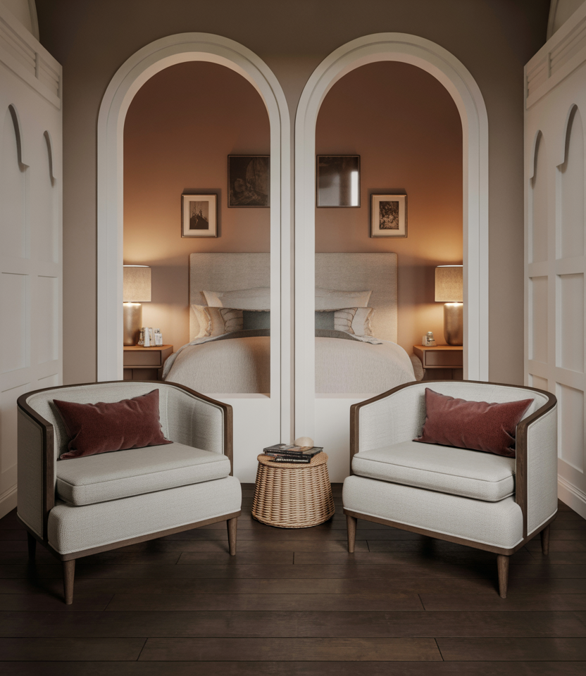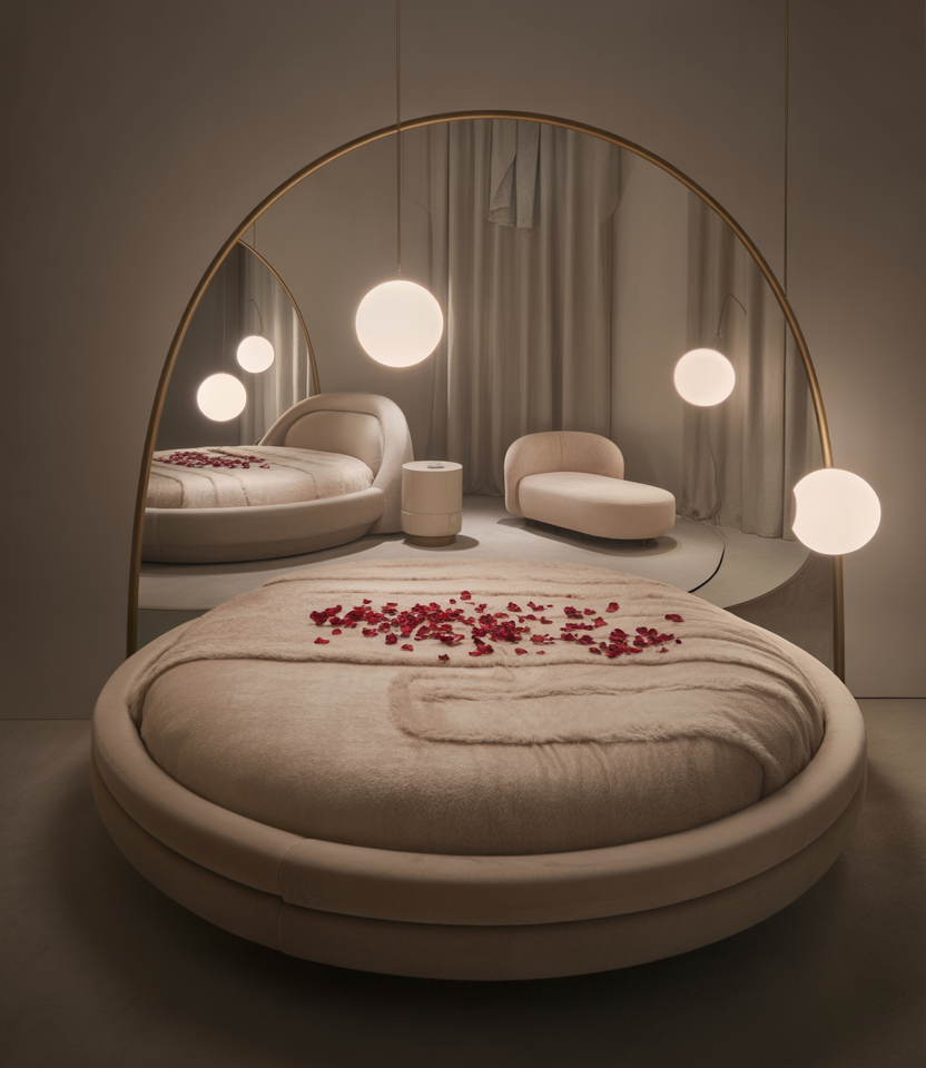 Bring in rounded shapes-crescent-shaped side tables, round-backed chairs, arched mirrors-to soften geometry for Valentine’s or couples’ hotel feels. Curves signal human presence. At a boutique showhouse, curvy nightstands were tender and refined.