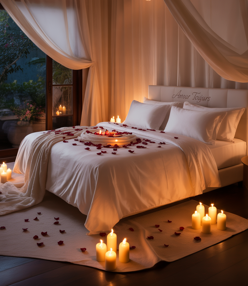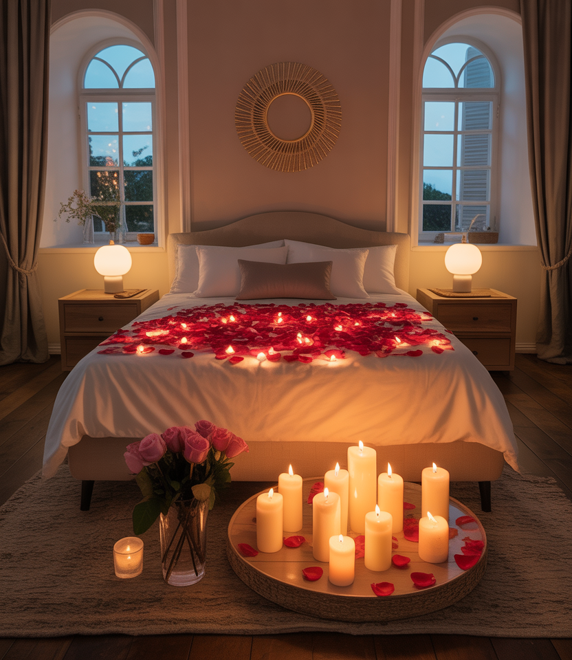 Candles, fresh roses, and rose petals scattered on an inviting softness will set the stage for lovers on Valentine’s Day, couples on love days, and anniversary nights. One can cluster candles of different heights, with LED safe alternatives. A friend created a filmic ambience by leading the way to a bed with rose petals for her partner.