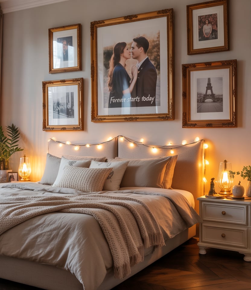 Dedicate a wall with framed mementos–polaroids, love letters, tickets–personalize the decor for anniversary, couples love, or his birthday nights. Keep frames cohesive. In my own home, I built a small gallery of our travels–every glance from the bed provokes happy recollection.