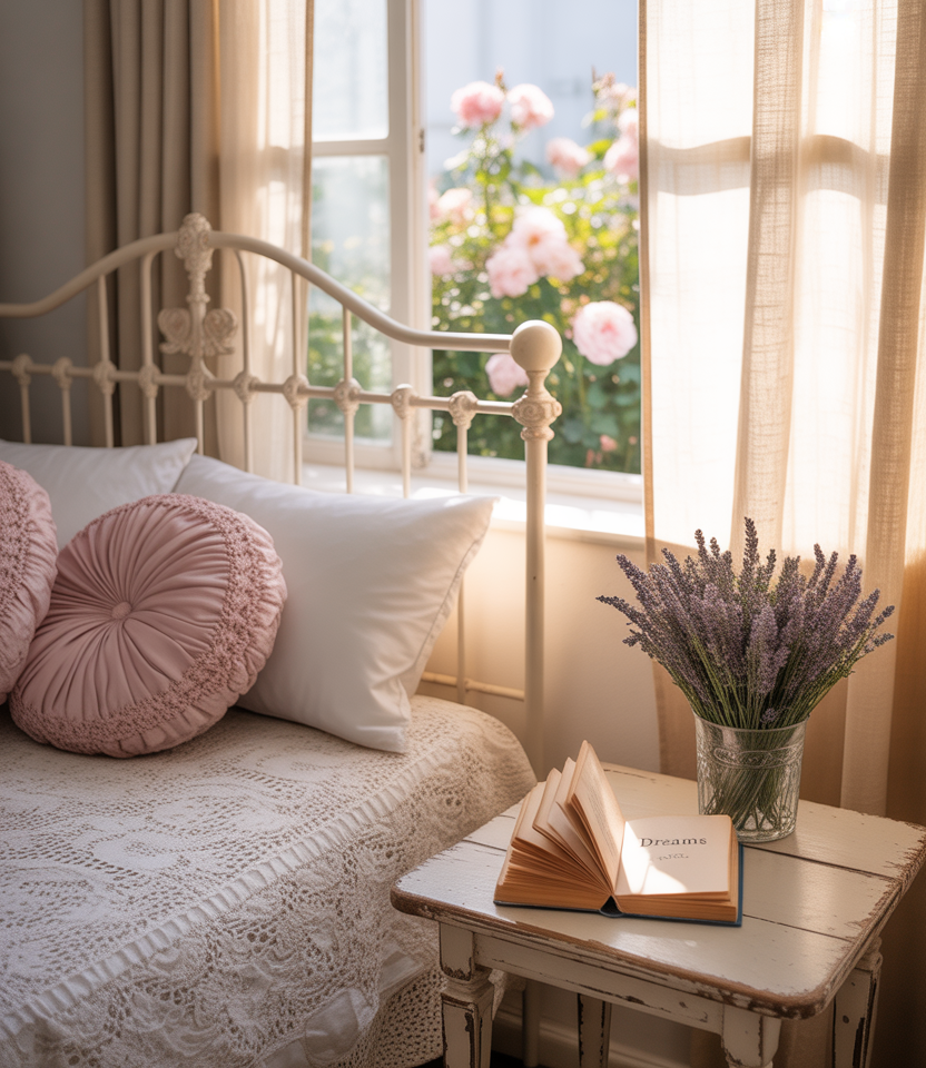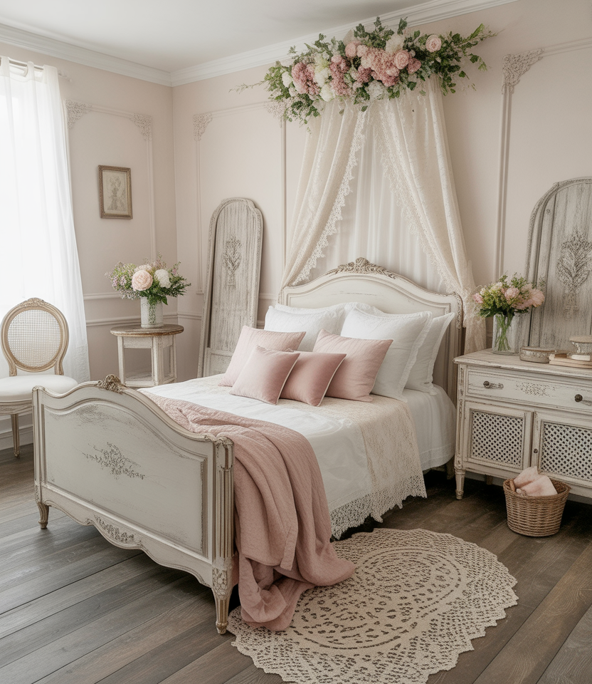A soft, feminine shabby chic room layered in muted pastels, distressed furniture, lace, and florals suits for Valentines Day room decor or for couples’ love at home. Use antique mirrors and delicate drapery. My grandmother’s guest room always felt gently romantic in shabby-chic style.
