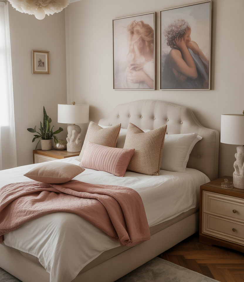 Commission or hang romantic artwork-sensual abstracts, soft couples’ silhouettes-to personalize decor for couples’ love or for him. Keep palettes muted to maintain calm. I hired a local painter for a portrait that became the romantic centerpiece of our bedroom.