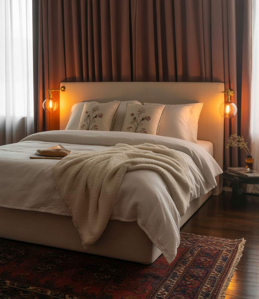 Heavy blackout curtains in dark tones dial intimacy in for couples’ dates or in the atmosphere for Valentine’s. Then layer with soft sconces or wall washers. I installed blackout panels and watched as our evenings felt more private and cinematic.