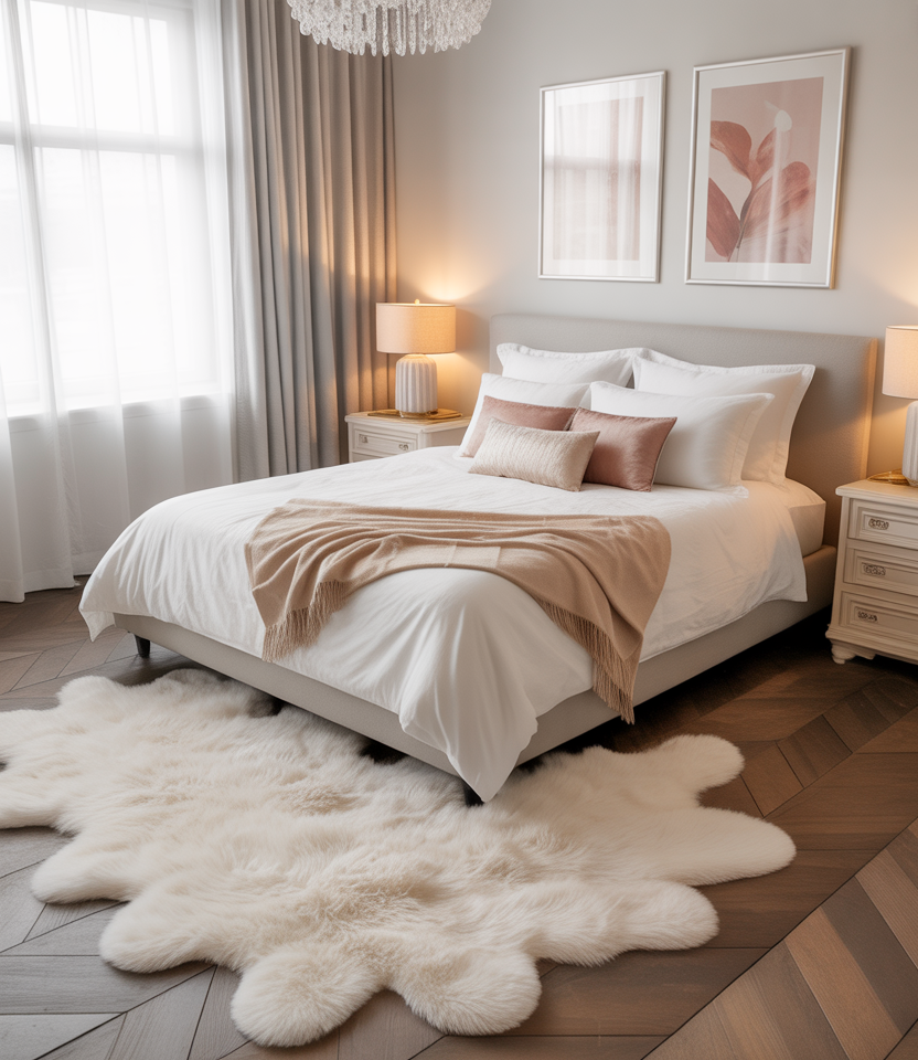Place a plush, high-pile rug under or at the foot of the bed to define romance zone for couples love or for date night simple moments. Choose abstract or tonal rugs. A designer I admire, Amber Lewis, often layers rugs to soften a room zone.