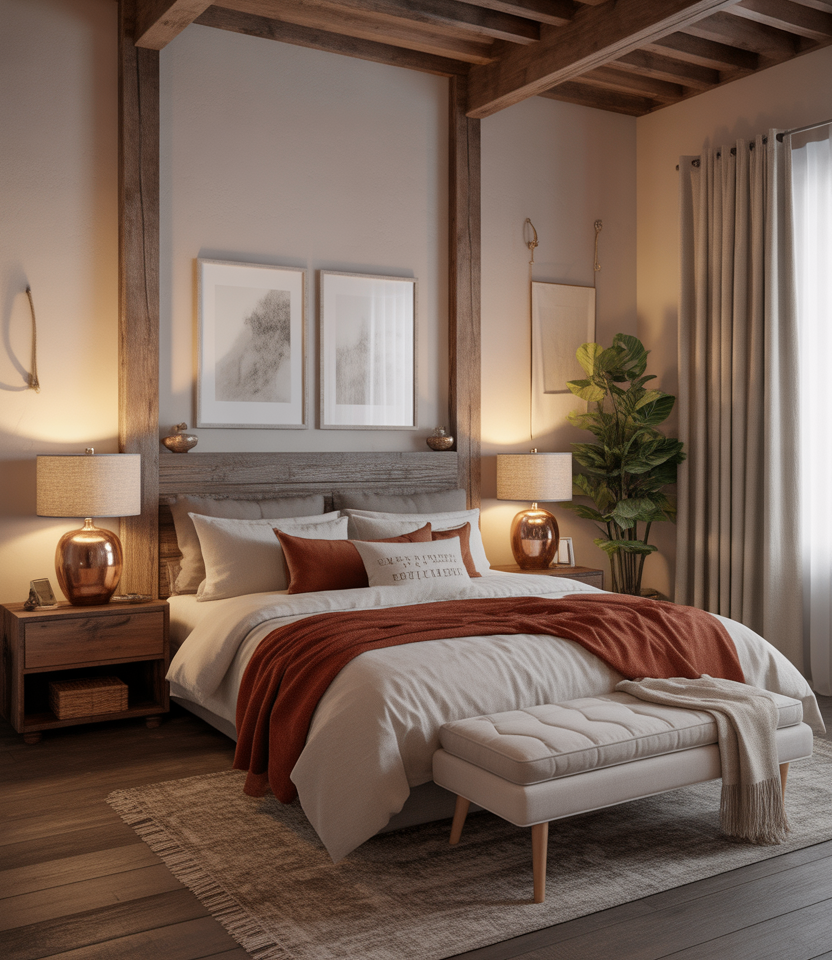 In a rustic scheme, reclaimed wood bed frames, woven rugs, and warm neutral tones bring comfort and intimacy for date night spent winter evenings. Add a fireplace or wood-paneled accent wall. At a cabin getaway, I fell asleep listening to a crackling fire—pure coziness.