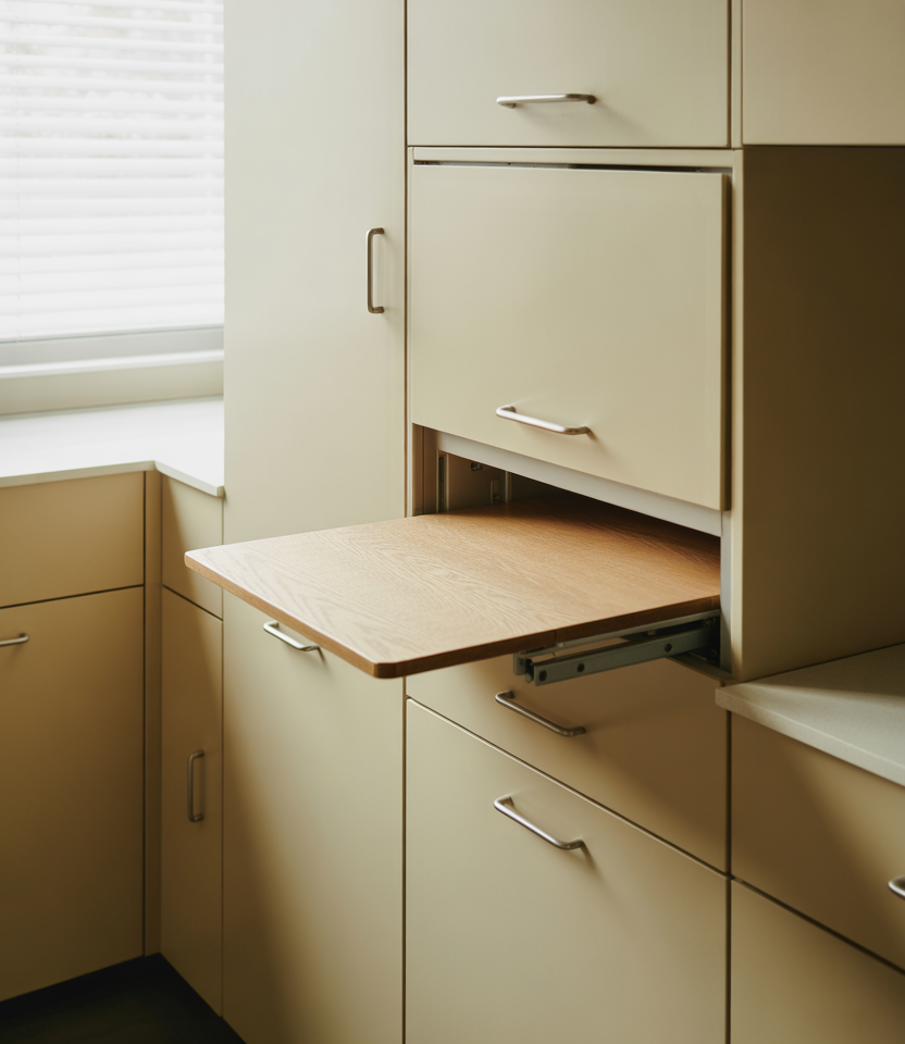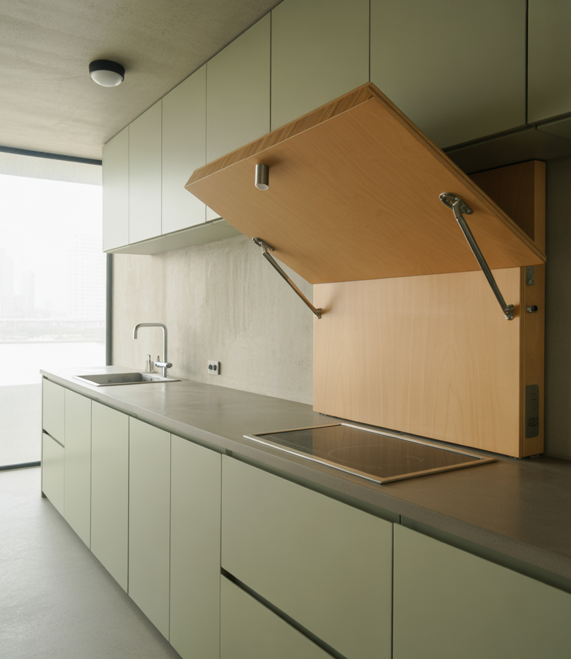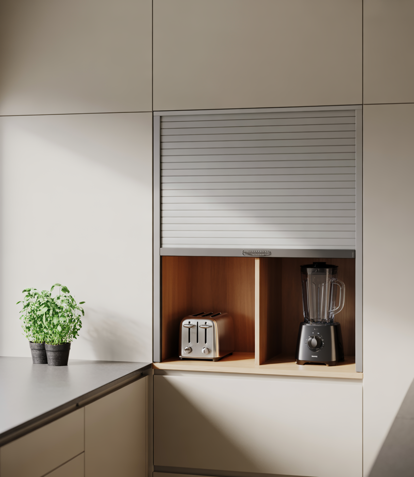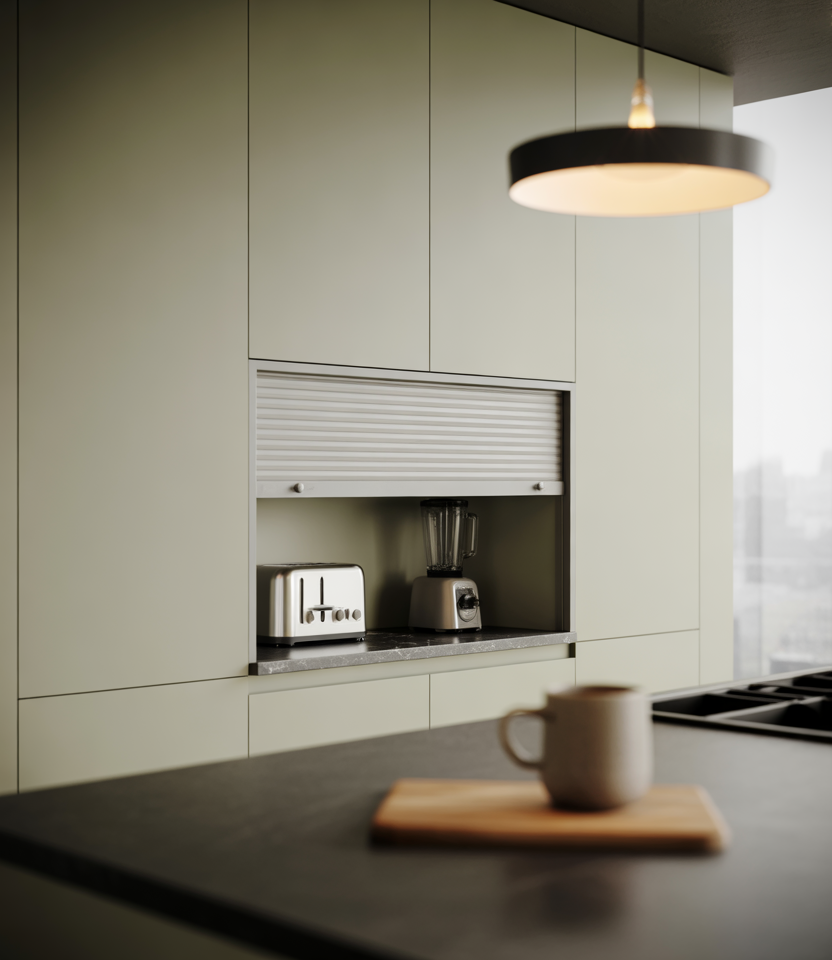 A roll-up “garage” door can hide small appliances—like toaster or blender—when not in use. This prevents counters from clutter and supports a clean layout aesthetic. Use in apartments minimalist settings or in apartments on a budget diy remodels to maintain visual calm.
