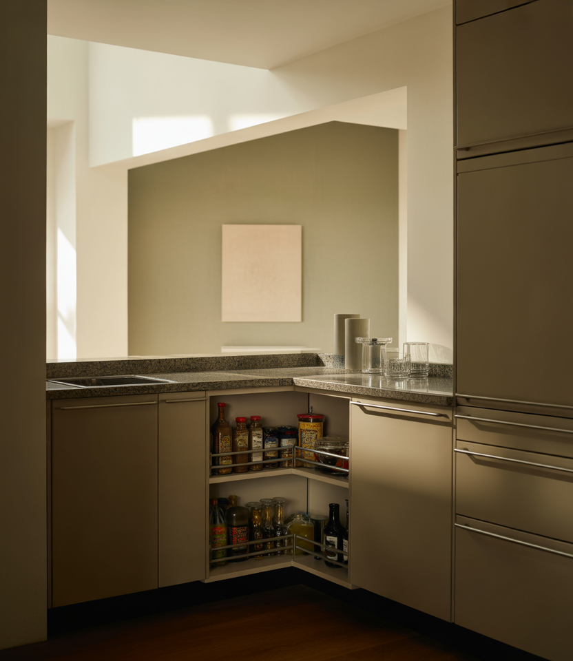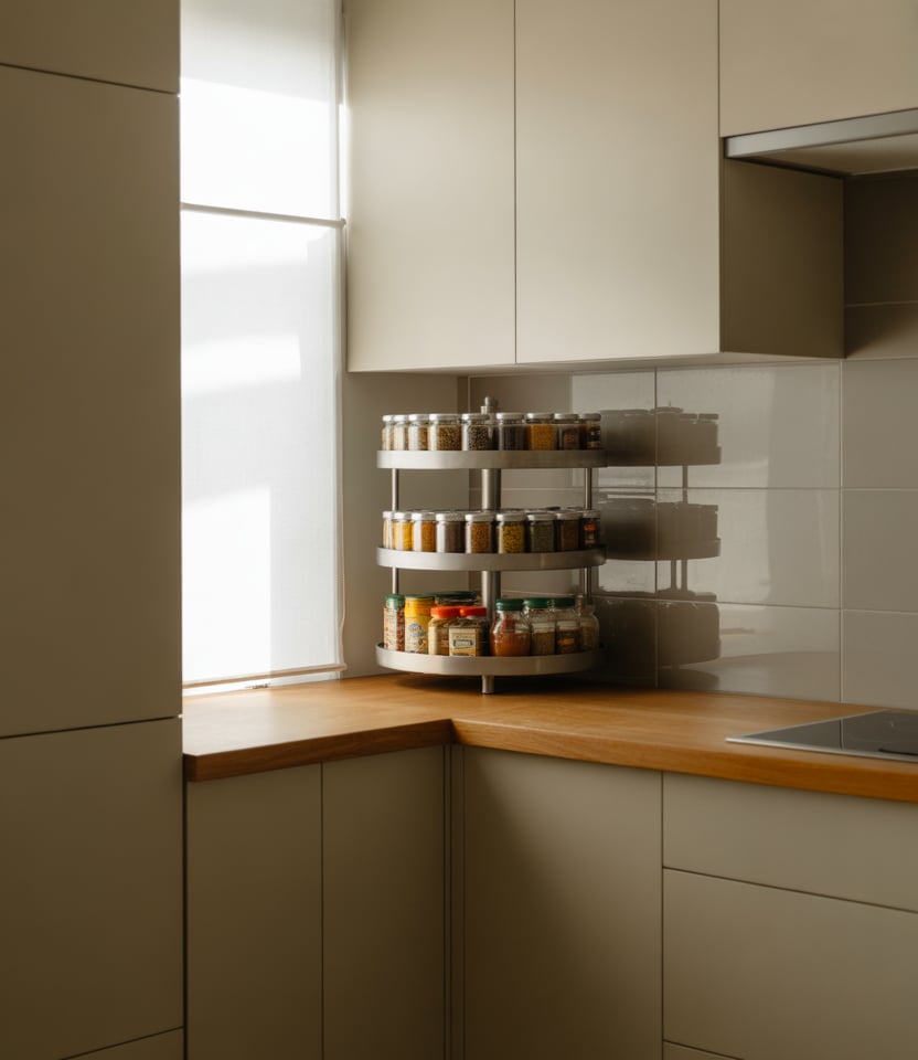 Use rotating carousels or swing-out shelves to grab the corners of deep corners in L-shaped or corner kitchens. Thus, the access of retrieving items and avoiding wasted dead space. Many modular lines (e.g., from IKEA or Blum) offer these. This is a classic design small apartments tactic to squeeze utility from awkward corners. Use in on a budget remodels too.