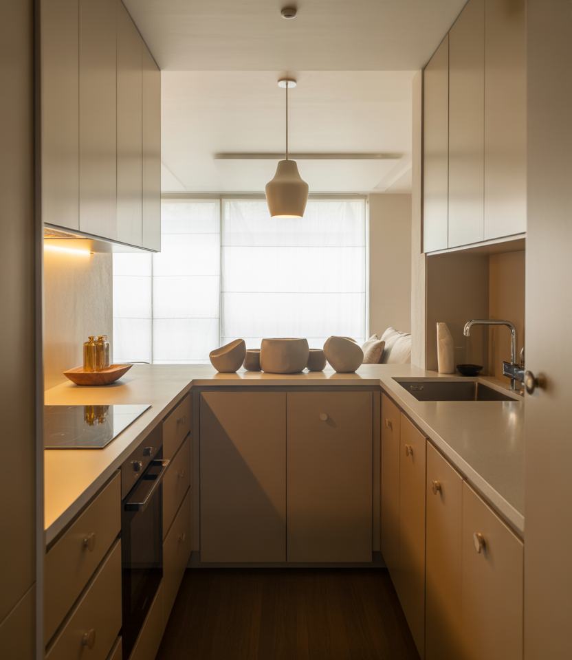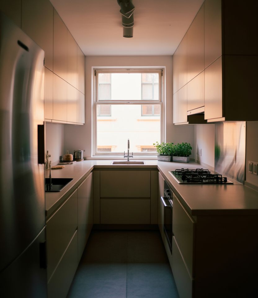 A galley conversion aims for cabinets-and-counters run in parallel to maximize efficiency in a narrow footprint. Perfect for use in studios or small spaces, it offers a compact yet very functional workflow. Design-wise, small apartments can probably go into placing a few open shelves, maybe one slim table-drop leaf, and a very minimalist finish as visual clutter. On a budget, floating storage and under-counter organizers can even be a DIY project.