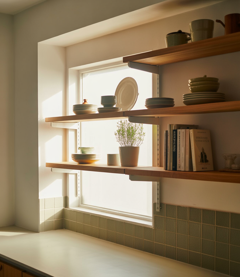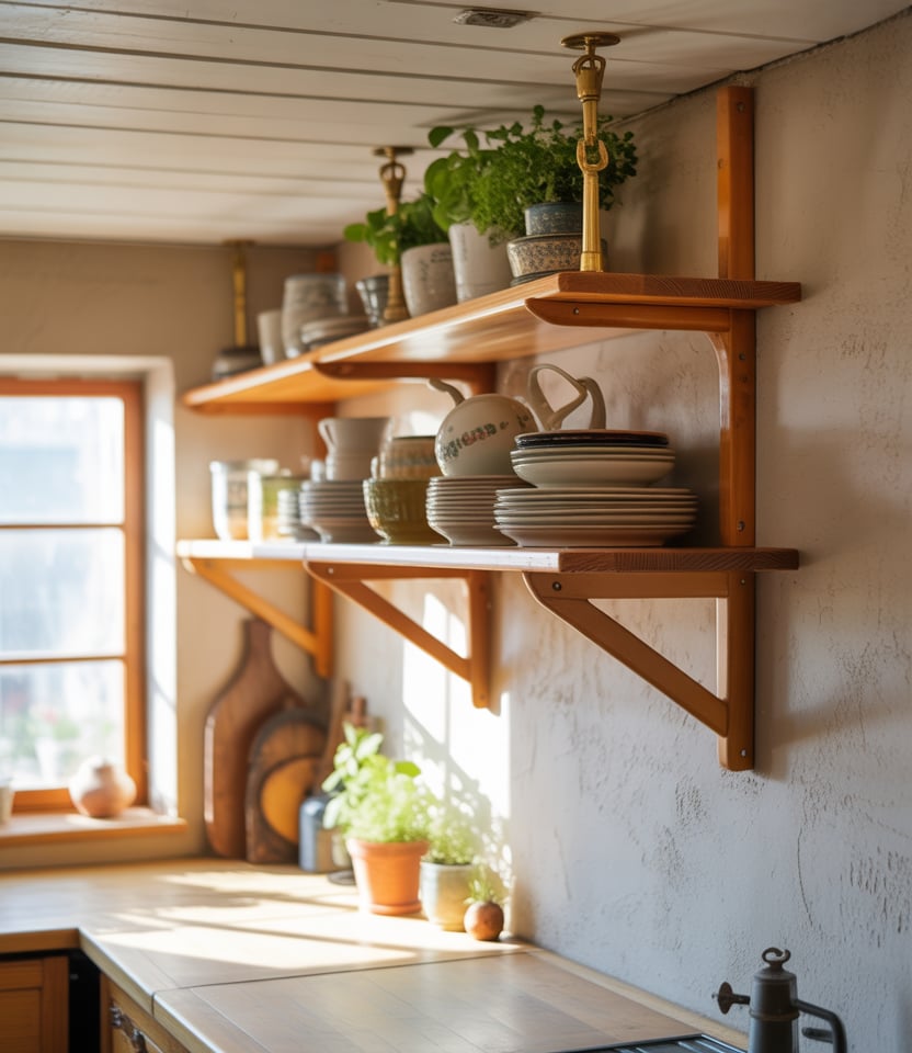 Remove bulky closed upper cabinets and replace with open shelving or floating shelves. This “breathes” into small houses or tight kitchens, enhancing sight lines. Use uniform containers to maintain order. Many decorators (such as Apartment Therapy) praise open shelving for increasing perceived space. This is a clean decor move that supports organization.