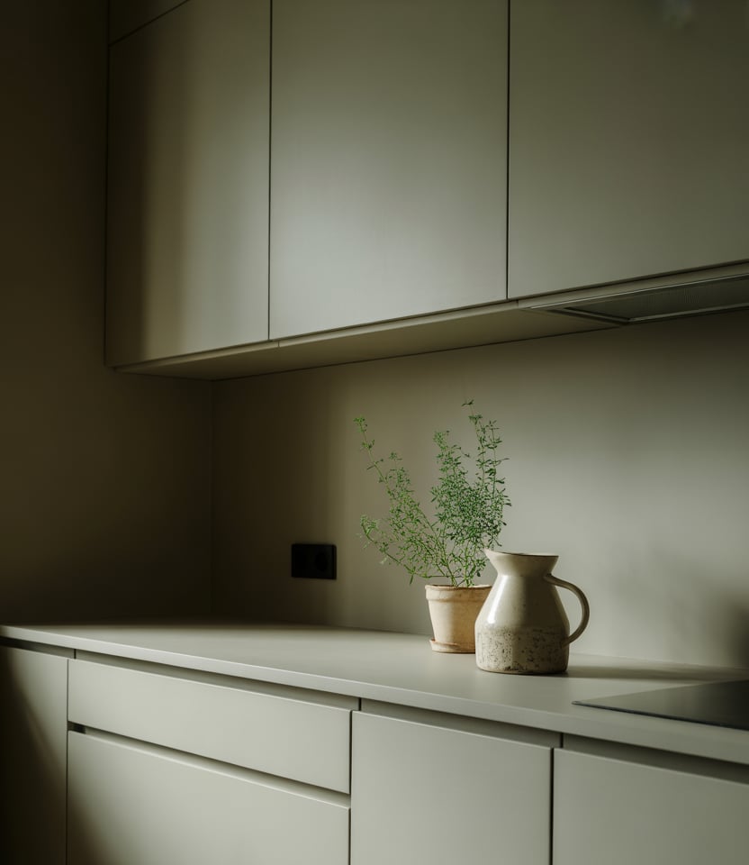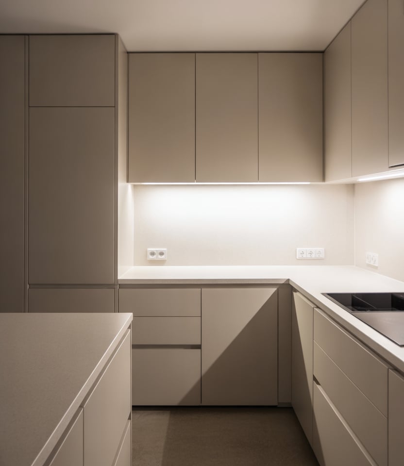 Using one dominant hue (or subtle variations) reduces visual clutter and complexity. In a tight layout or apartments minimalist space, this allows cabinetry, walls, and handles to recede. It contributes to a calm, elegant design layout. Accent with texture or one contrasting tone for interest.