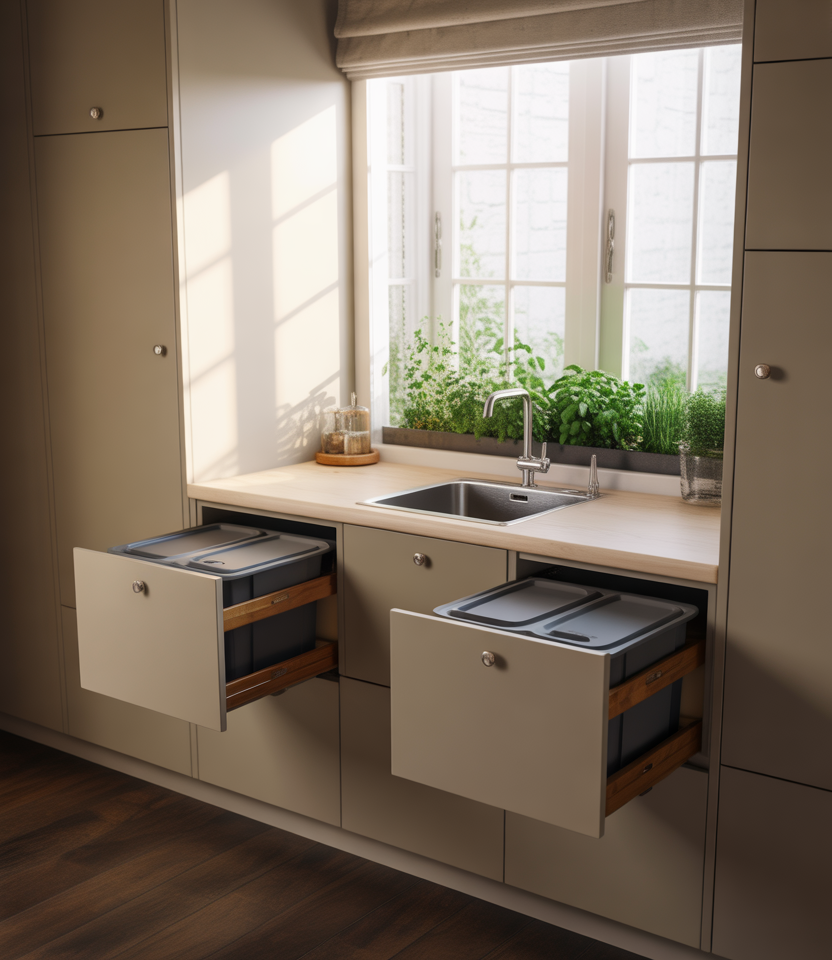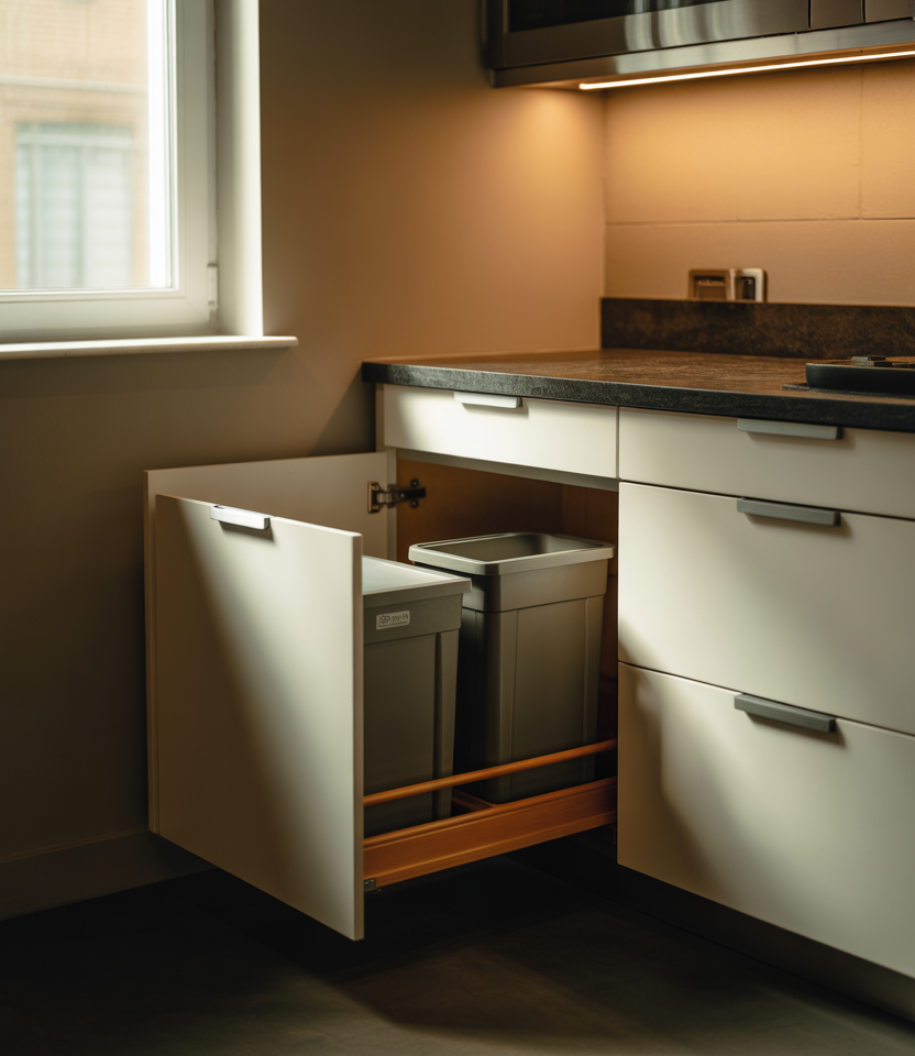 Trash bins often take valuable floor area. Hide them inside cabinets using slide-out bins or tilt-out panels. This supports tidy organization and keeps floors clear. In a layout small spaces kitchen, it’s a high-impact storage detail many designers stress.