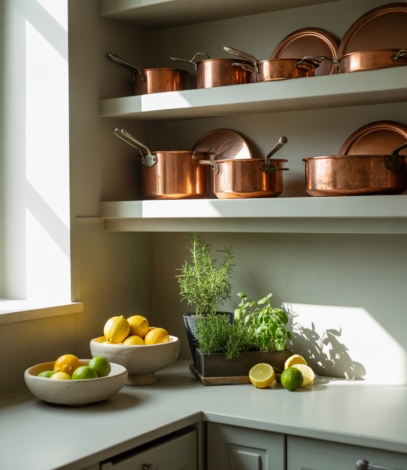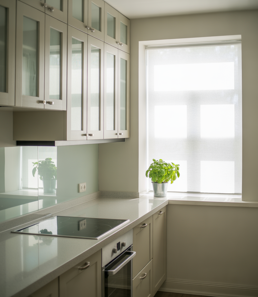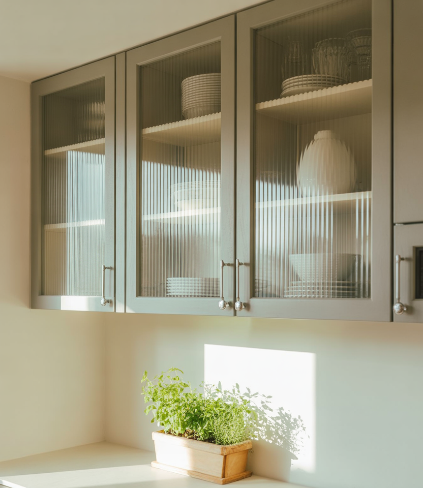 Use glass-front cabinet doors or clear acrylic panels to lighten the visual weight of upper storage. This introduces an airy quality while still serving the organization purpose. In tight kitchens, it avoids heavy visual blocks. Use uniform dishware to maintain a composed look.