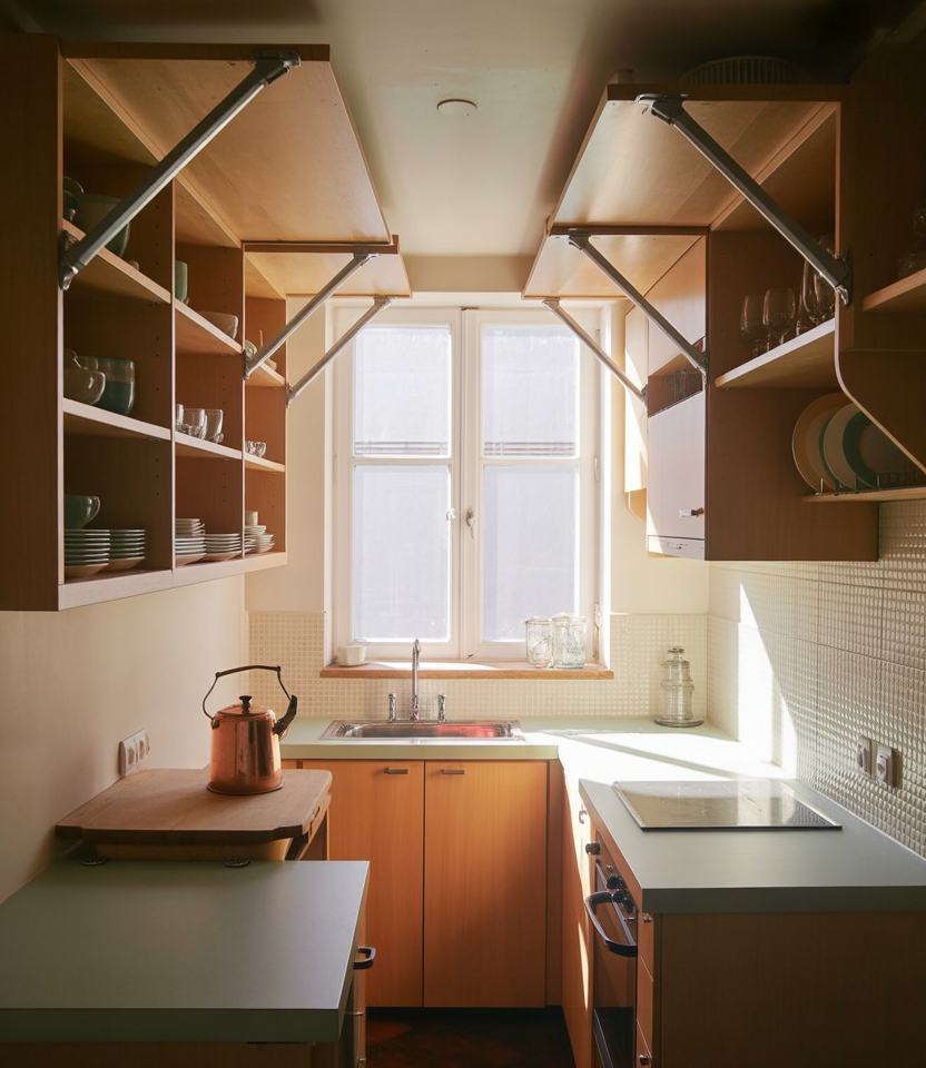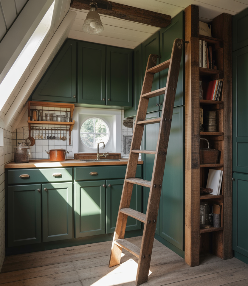 Above a work zone, use lift-down shelving or pulley-style cabinets so you can reach high spots easily. This allows you to maintain high storage (ceiling level) without sacrificing accessibility. In a layout floor plans approach, this lets you use the full vertical volume. It’s a smart organization trick for lofty tiny kitchens.