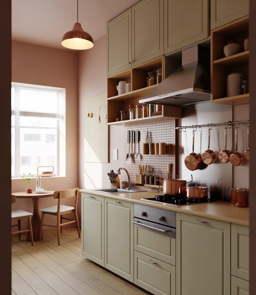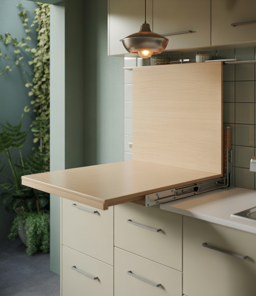 When you need a table for dining or prep, choose one that folds down or slides out from cabinetry. This is ideal in apartments studios or tiny kitchens where every inch matters. It ties into Ideas on a budget by using simple hardware. You can hide it when not in use to maintain a clean layout.