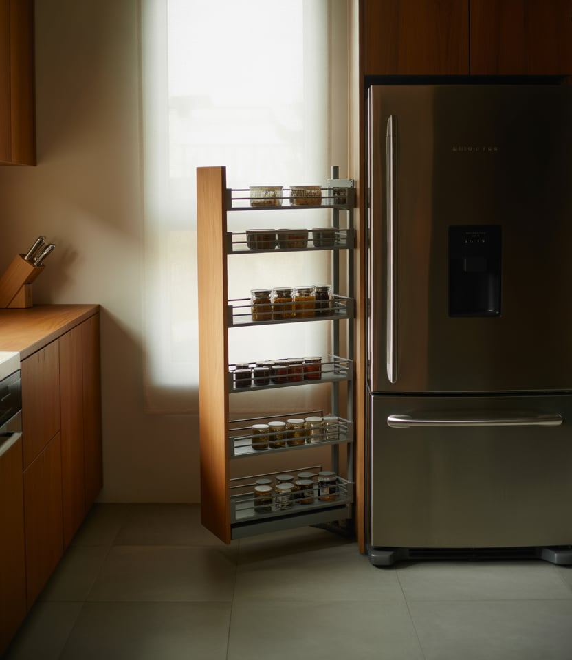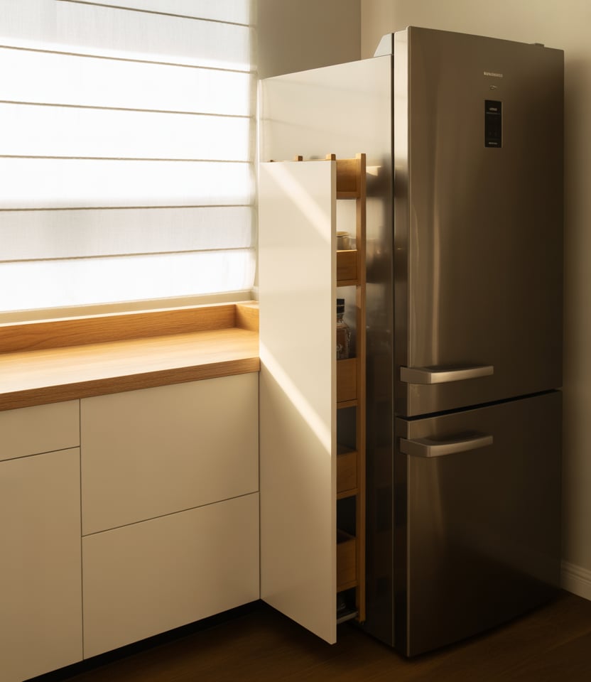A tall, narrow pull-out pantry (often only 6–8 inches wide) maximizes storage ideas in tiny gaps between appliances or walls. Use it for canned goods, spices, or baking sheets. This suits apartments space saving ideas perfectly. Even on a budget diy, you can build a simple pull unit with plywood and slides. It integrates into layout plans seamlessly.