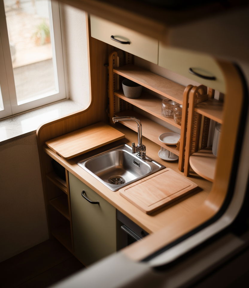 Multipurpose hardware (e.g., cutting board over sink, collapsible colanders, fold-in sinks) helps maximize function. In layout one wall or galley kitchens, these extras can replace bulky appliances. Use for both prep and storage. This is a clever design layout trick for Ideas on a budget kitchens.