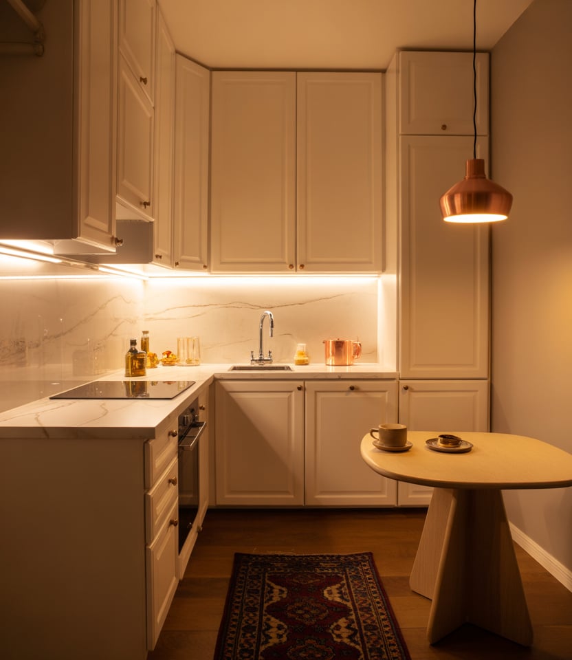 Good lighting makes a space feel larger and more inviting. Install under-cabinet LED strips, puck lights, or inset fixtures to brighten work areas. In a tiny kitchen, proper decor lighting is as important as layout. Quality lighting enhances visibility and ambiance, making even a modest space feel premium.