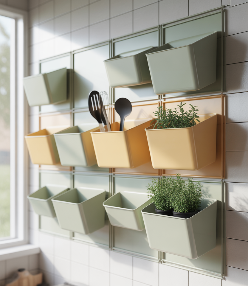 Install modular wall grid panels (steel or pegboard) and attach magnetic or hook bins. This redefines your wall area into functional storage ideas rather than blank surfaces. It’s one of the most flexible Hacks for changing needs. In apartments minimalist or layout small spaces kitchens, this system adapts over time.