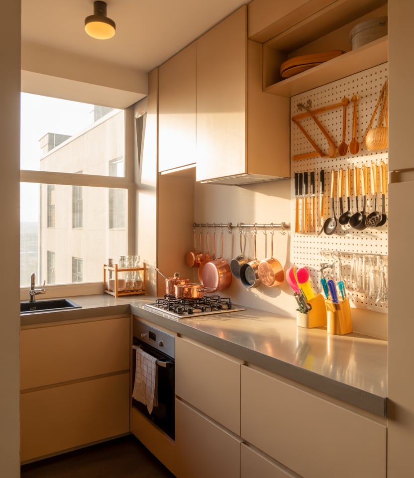 Mount magnetic strips, rail systems, and pegboards on idle walls. This frees counter space and gives flexible organization of pots, utensils, knives. For apartments on a budget, steel rails are affordable and easy to install. Use modular hooks and containers for instant storage ideas. This is one of the easiest Hacks to improve usability in a layout small spaces kitchen.