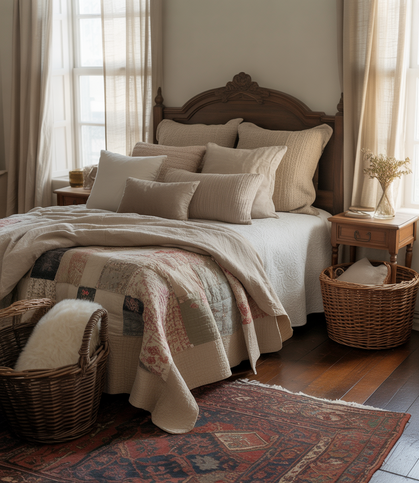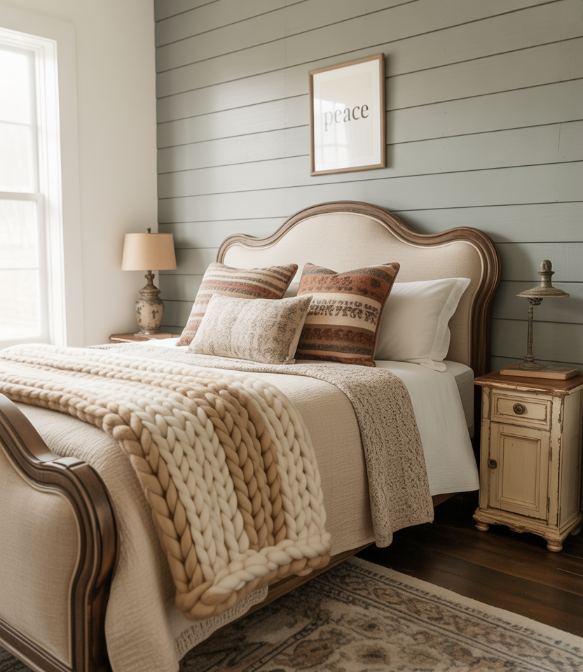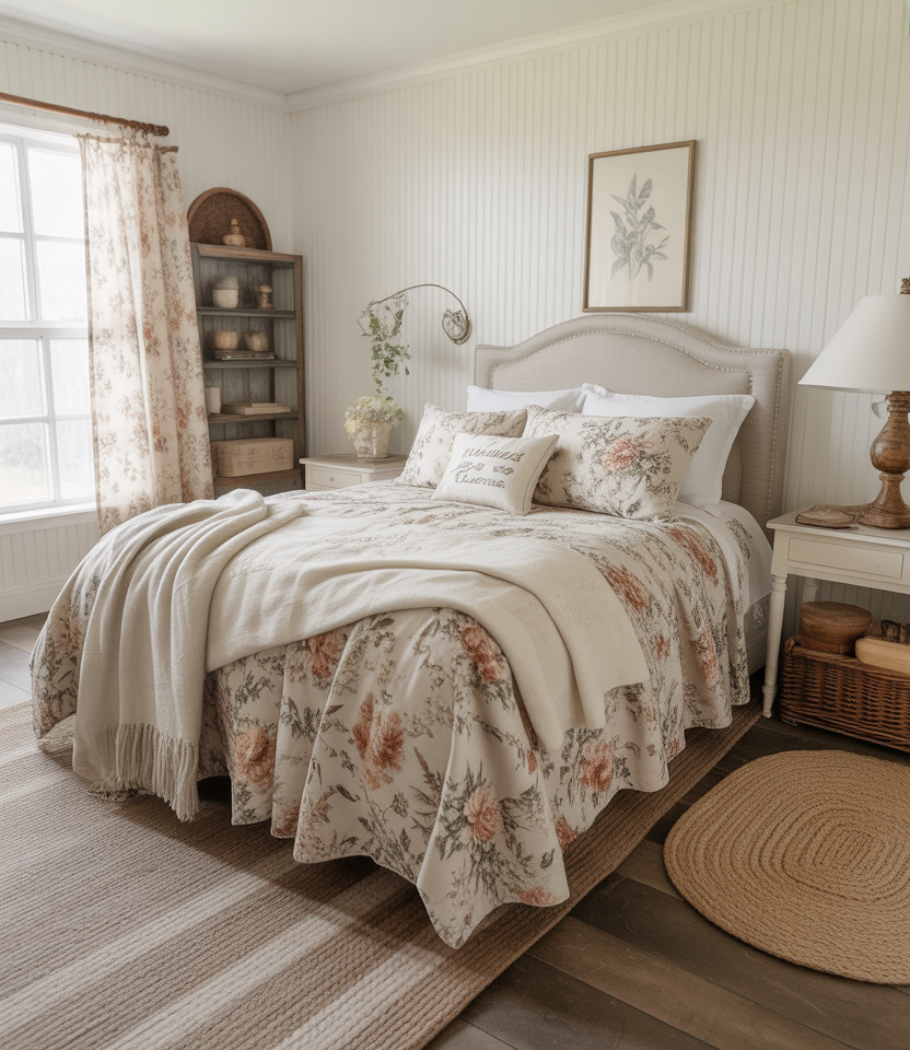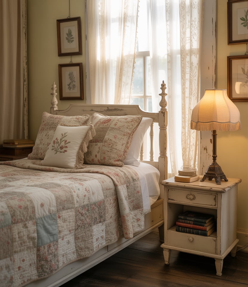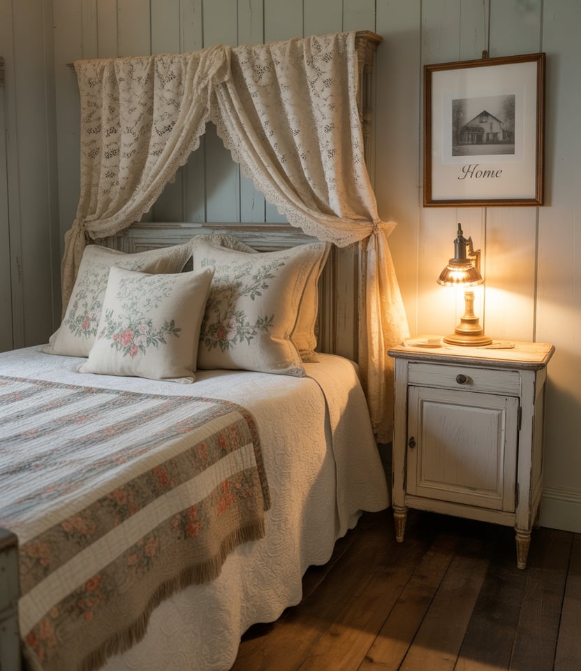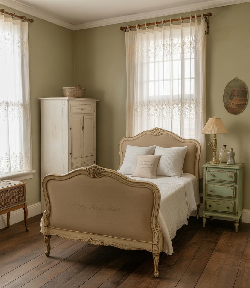 Celebrate Vintage farmhouse character with found pieces—antique dressers, salvaged mirrors, repurposed crates. This looks very personal and picturesque. I once rescued an old armoire and refinished it; in the bedroom, it was an instant conversation piece. Pair with soft paint colors like creamy white or pale gray, lace curtains, floral quilts, and subtle wall decor to finish the look.