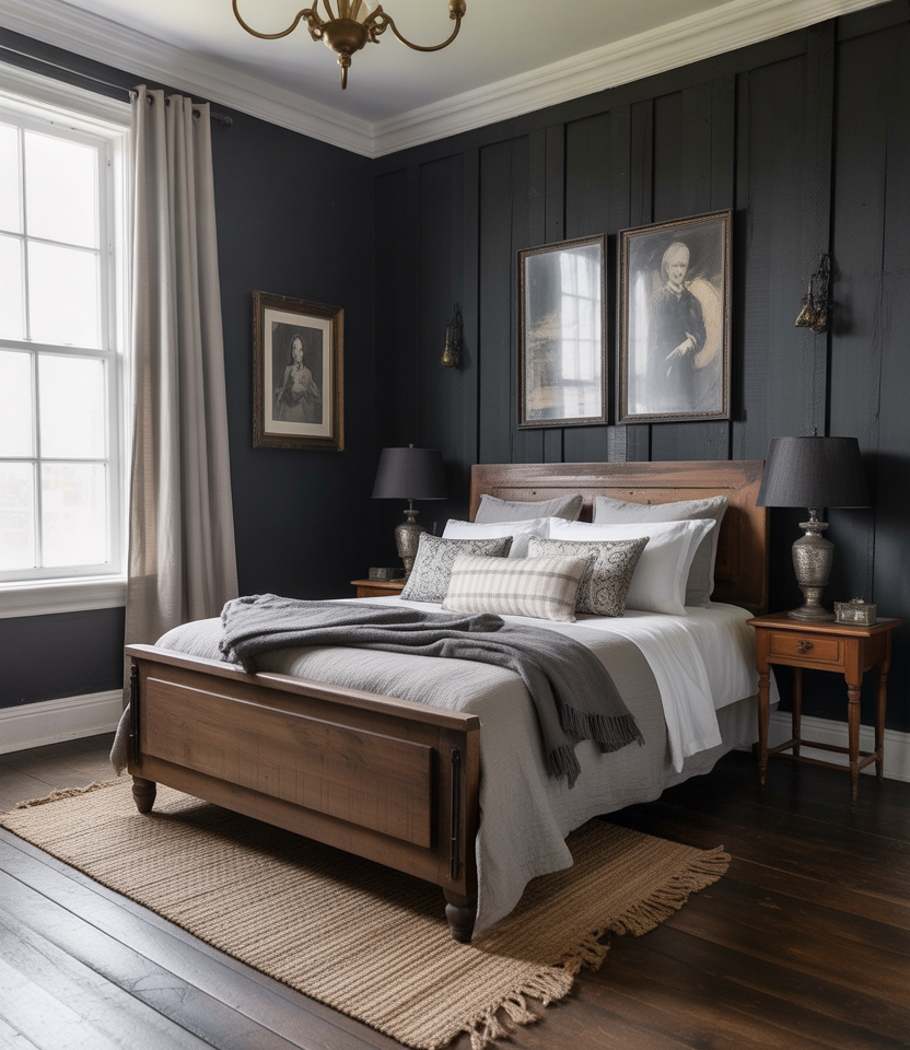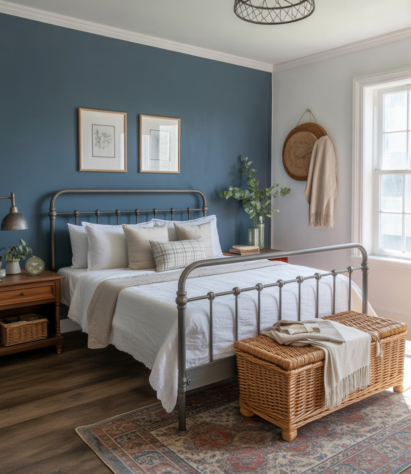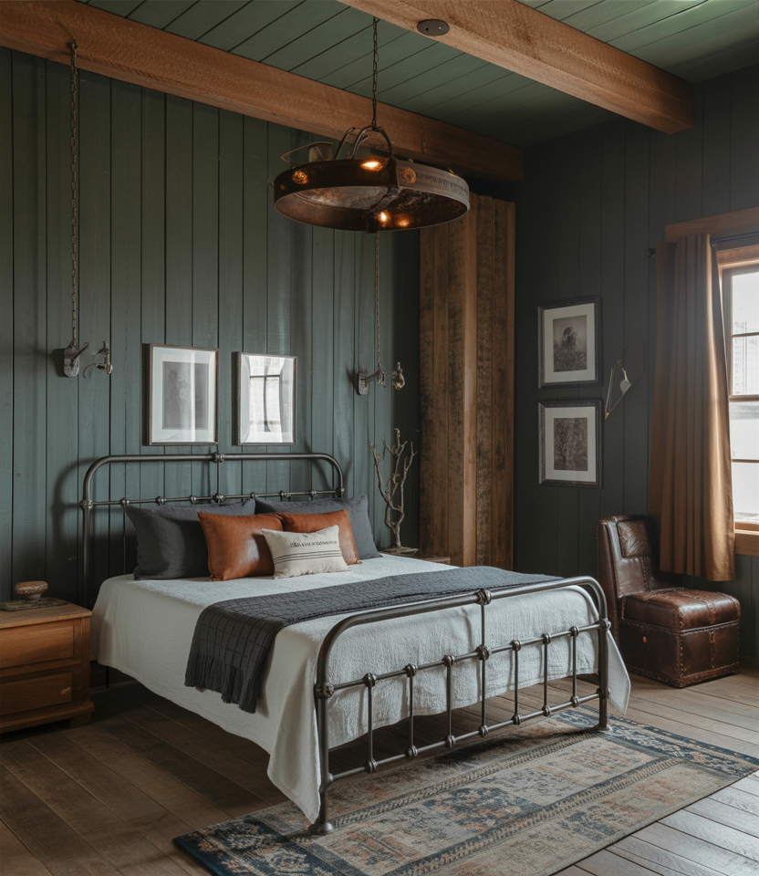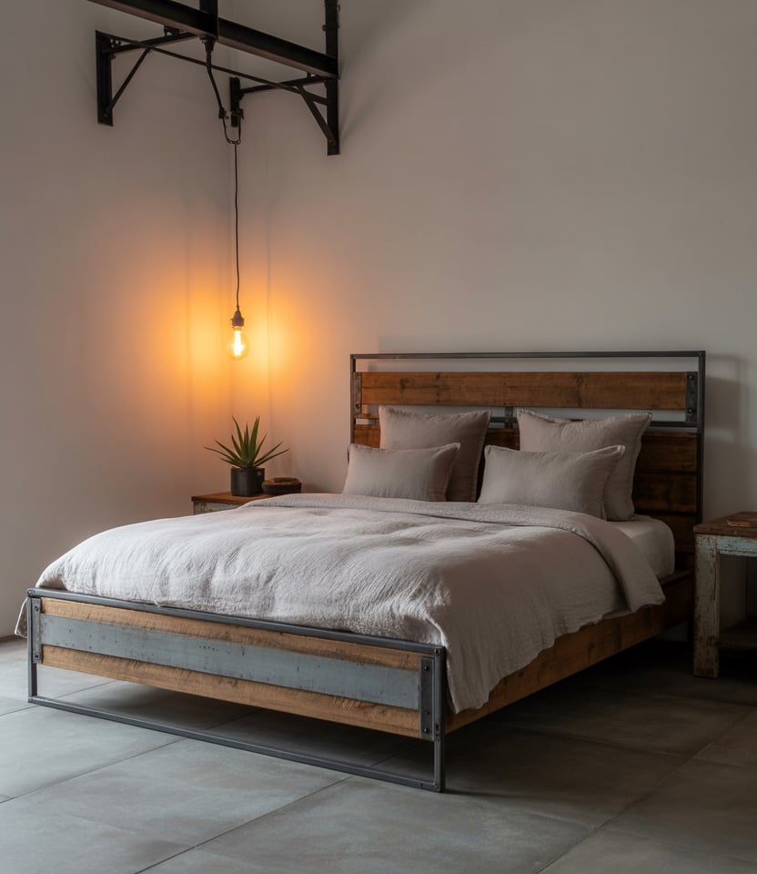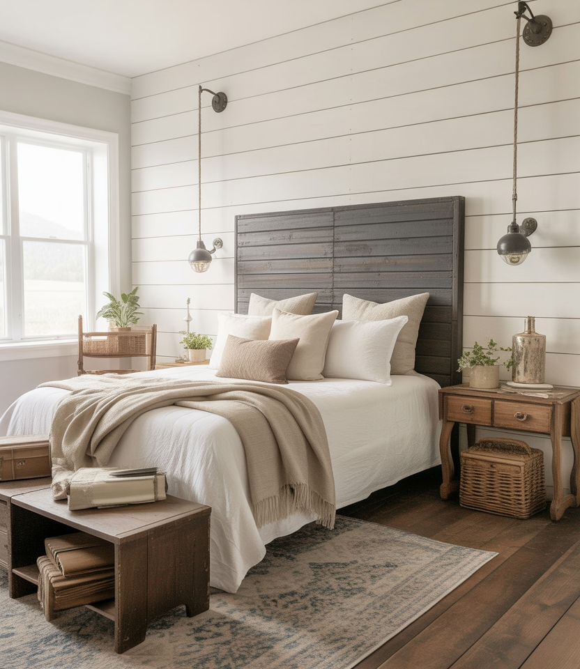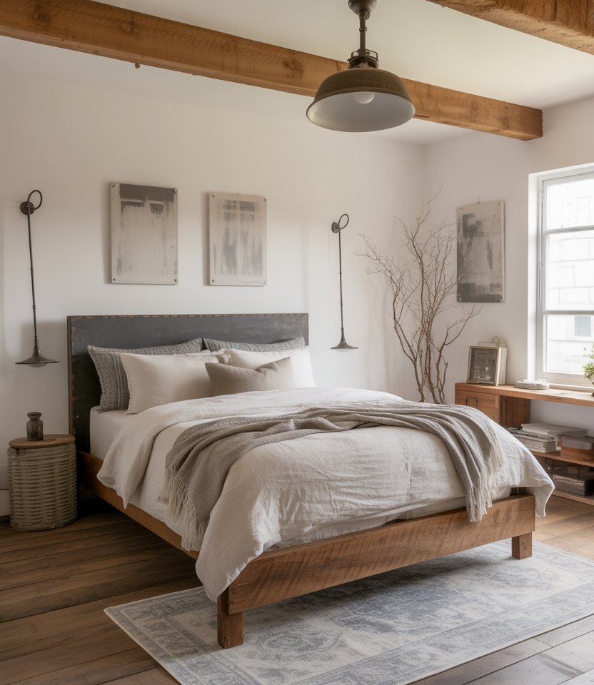 Combine Indust (Industrial) elements such as exposed pipe shelving, metal light fixtures, and concrete accents with farmhouse warmth-low reclaimed wood, soft linens, weathered furniture. In a loft project I designed, combining steel pipe nightstands and barn doors with shiplap walls struck the perfect balance. Use Edison bulbs, metal bed, and neutral linens. Let wall decor be pared back to avoid clutter.