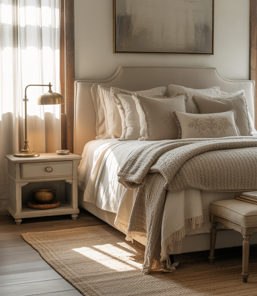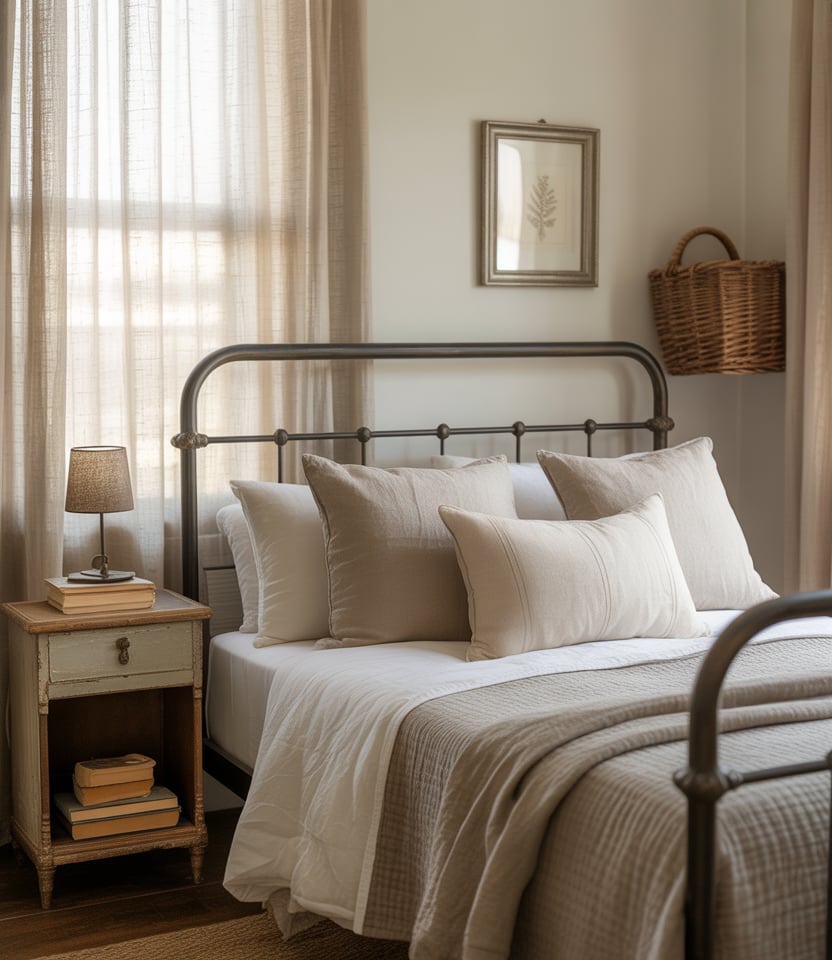 Design a dreamy master suite with layers of texture, warm lighting, a mix of vintage and modern furniture, soft curtains, and curated wall decor. This decor idea is about creating a sanctuary. In my journalistic visits to farmhouse homes, the owners often cite the master suite as their favorite hideaway. Use neutral colors, cozy throws, seating nook, and perhaps a metal or wood bed.