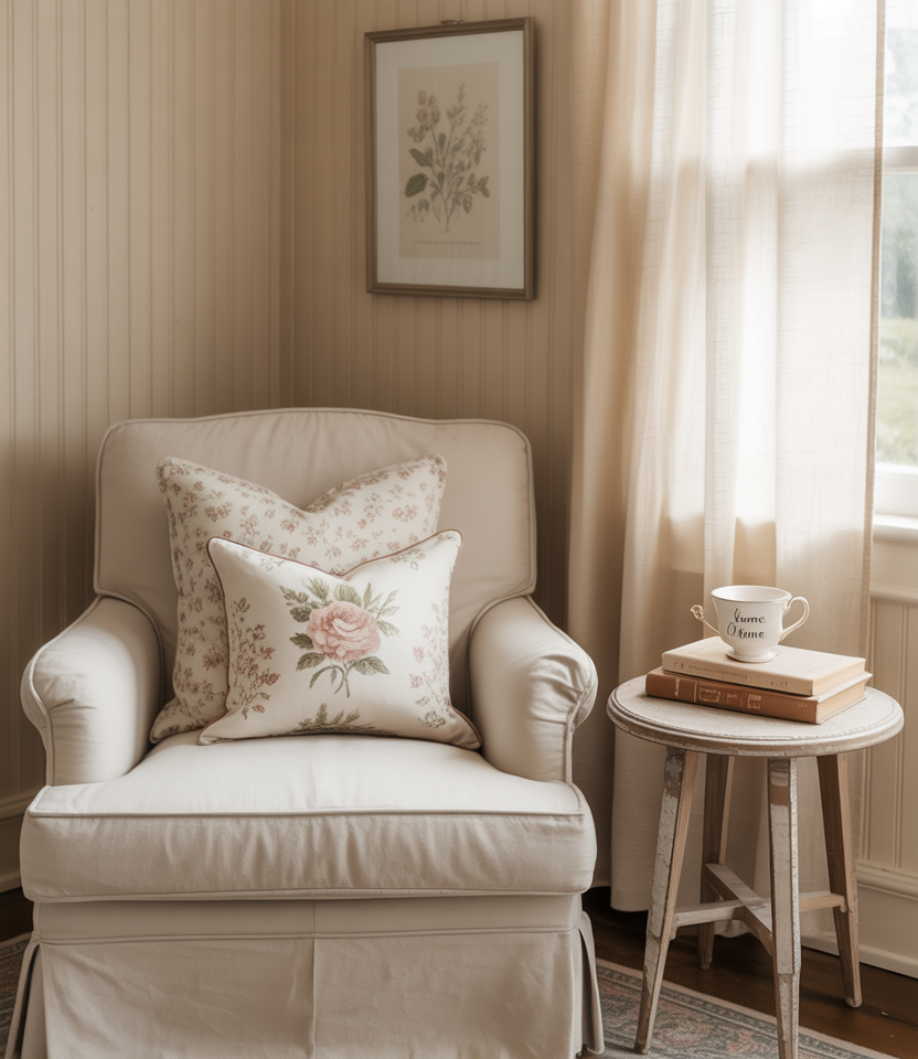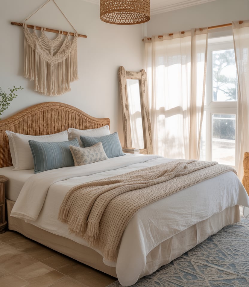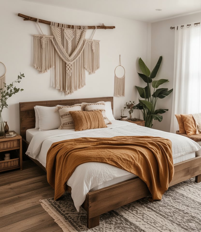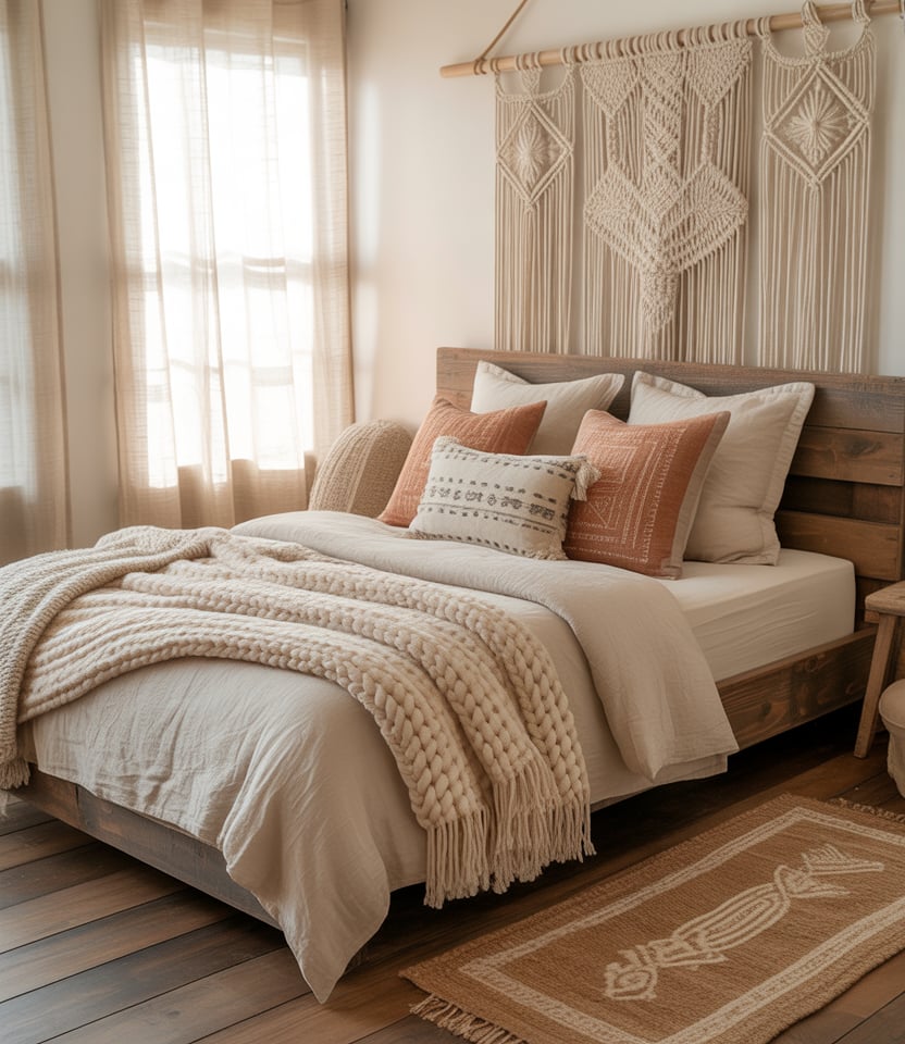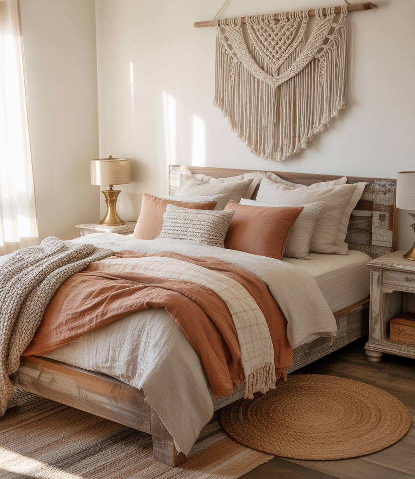 Boho-Rustic farmhouse fusion creates a warm, layered sanctuary: think macramé wall hangings, woven rugs, textured throws, and reclaimed wood furniture. My sister’s country cottage showcased this style with a lot of character and soul. Use muted earthy tones such as terracotta, sand, and sage set against soft-white walls. Throw in plenty of throw pillows and layered textiles for that laid-back, bohemian Cozy vibe.