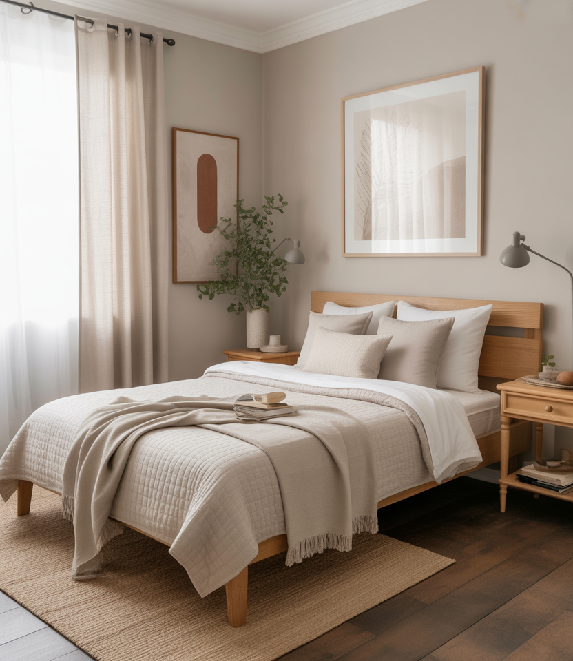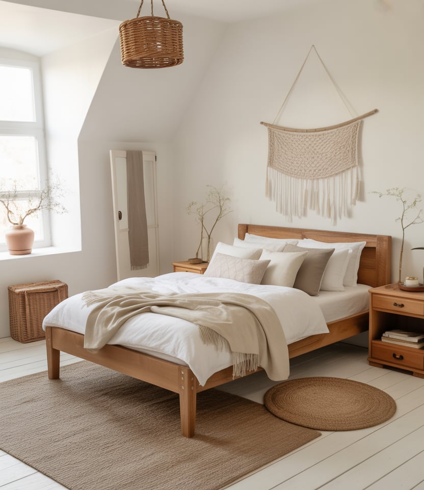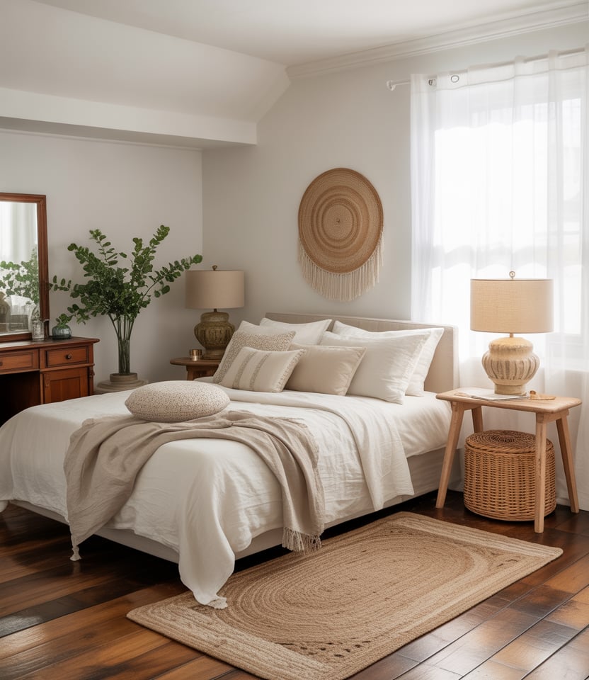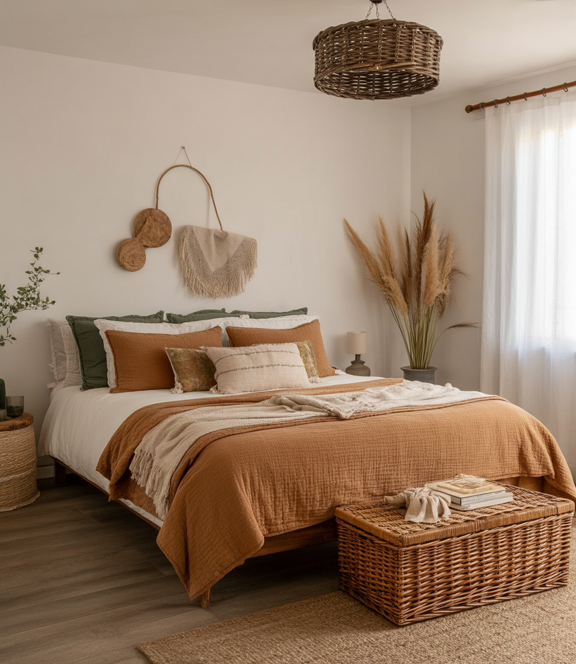Operate a natural look with warm browns, ochres, terracotta, and forest green in textiles and surfaces. This inspiration would be the good option for smaller rooms, layering natural textures brings enormous depth without cluttering. I styled a cabin retreat once using jute rugs, woven baskets, and linen bedding; guests felt right at home in nature. Mix raw wood furniture with clay pots, leafy plants, and subtle decor accents.