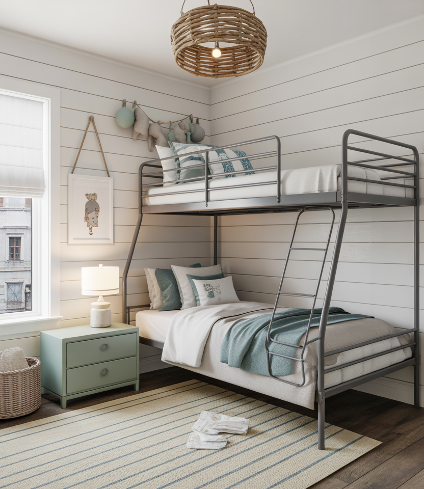Kid’s bedroom design with some farmhouse flair is about mixing whimsy with practicality. White shiplap, chalkboard walls, bunk beds or metal beds, and playful prints. When I decorated my niece’s room, barnstars, soft quilts, hanging baskets, and bunting were the order of the day — she loved it. Throw in sturdy furniture and washable rugs with bright colors like sage, mint, or robin’s blue. Simple wall decor and cozy layers are your best bets.
