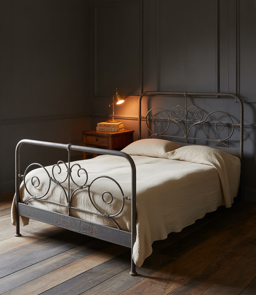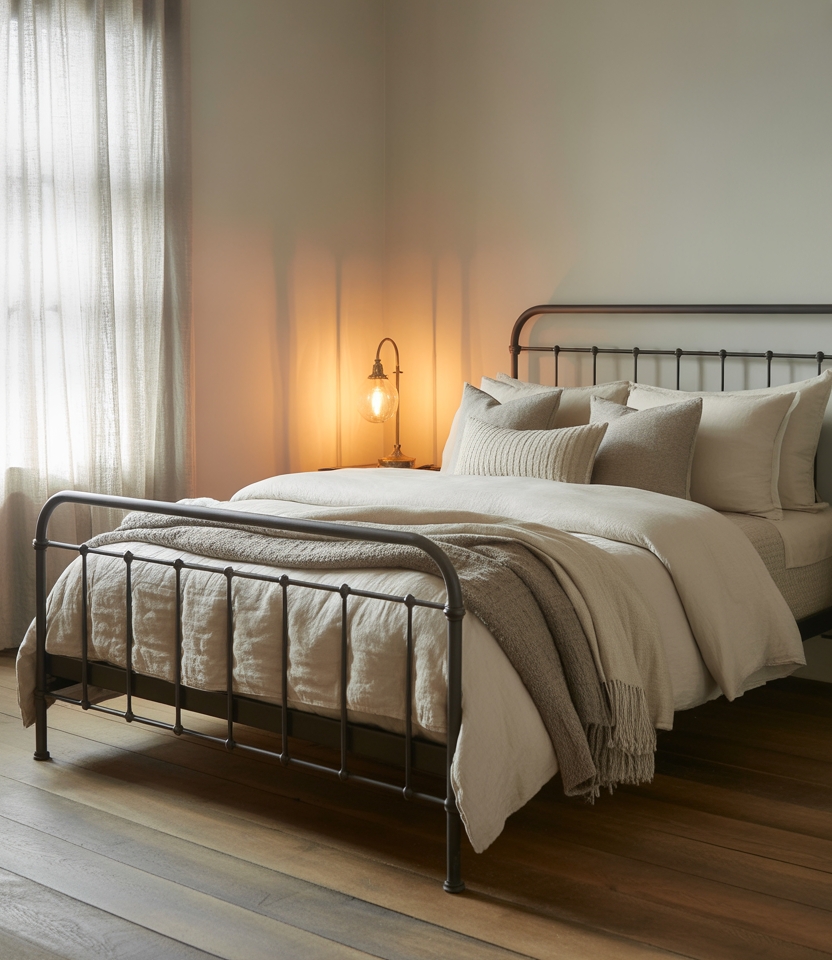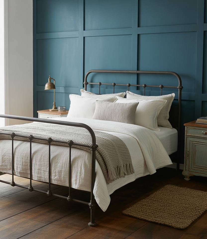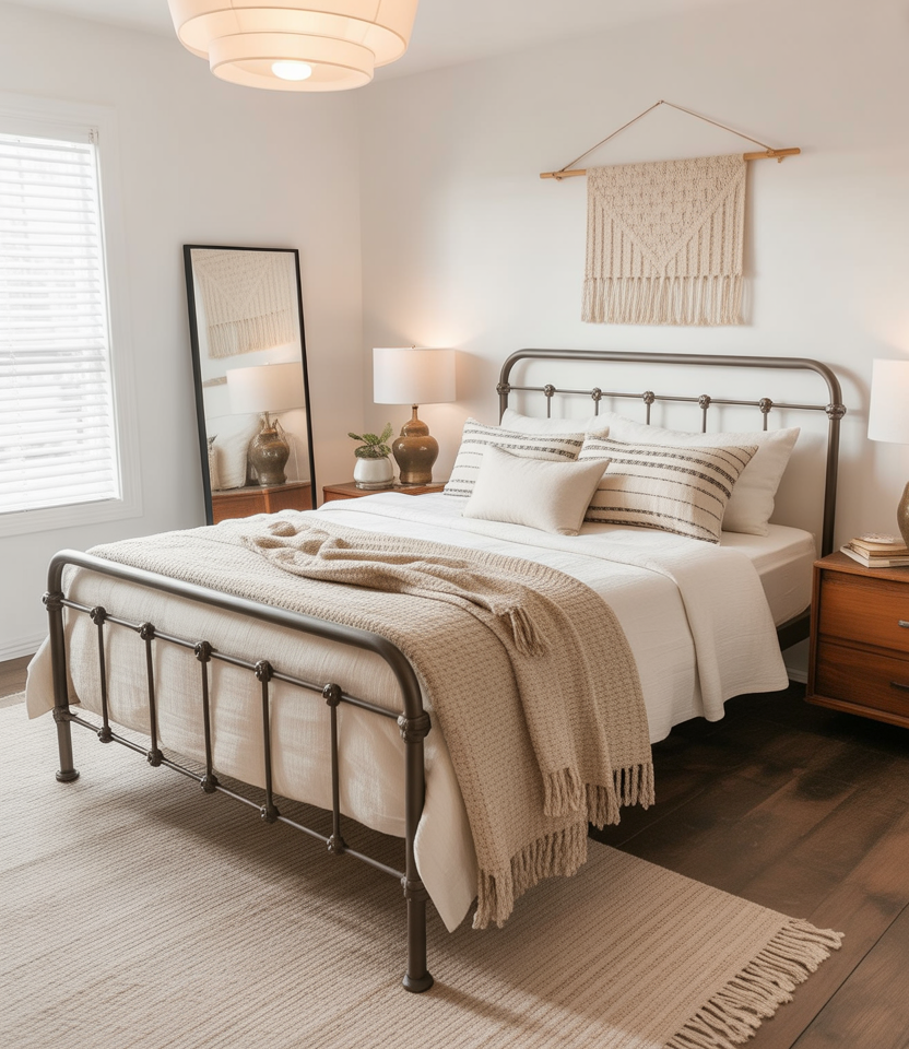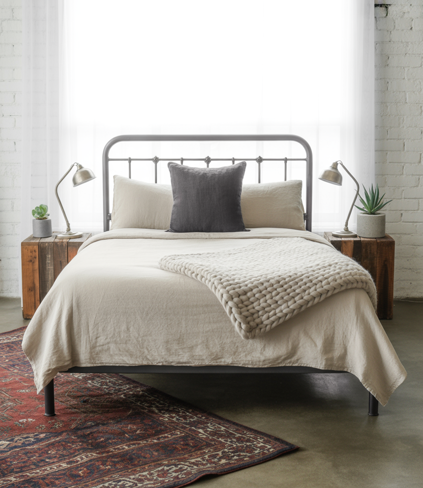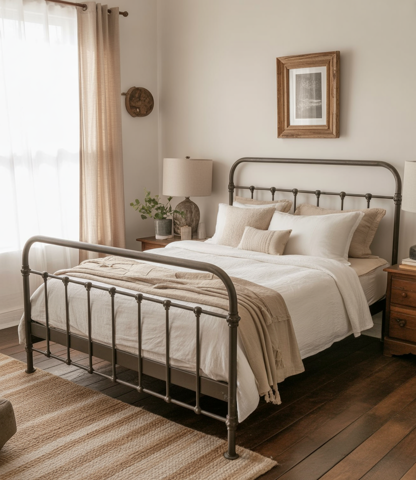 A metal bed (or with metal accents) in black, white, or brass finish creates a great backdrop for vintage-industrial flair. This decor idea will fit a Modern, Rustic, or Boho farmhouse Custom. I once refurbished a wrought-iron bedframe surrounded by soft linens and wood accents. The stark contrast was heartily witty. Top with wood nightstands and linen curtains along with simple wall decor.
