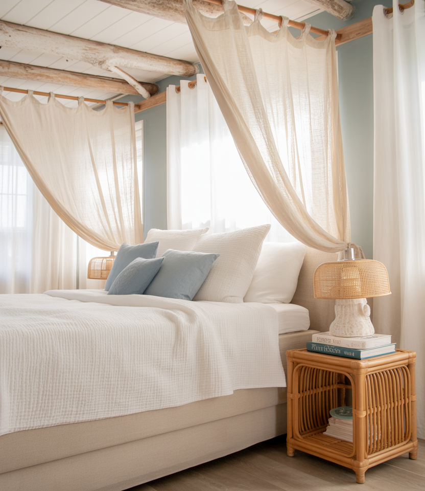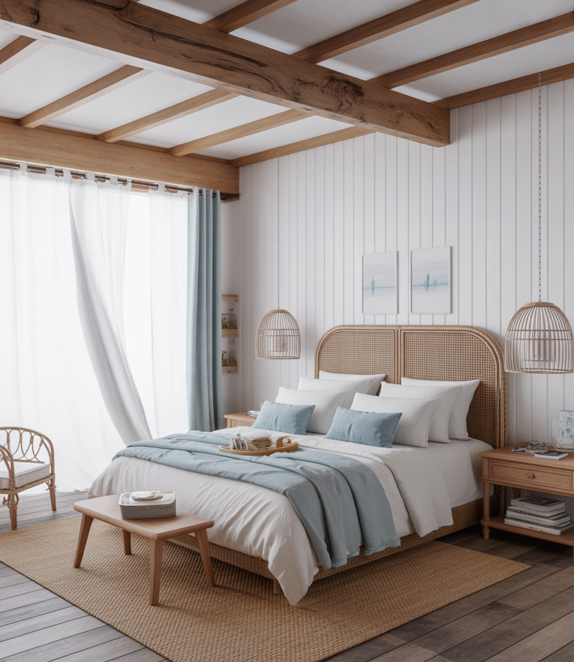 Marry the airiness of Coastal and the layers of Boho: driftwood finishes, woven pendants, shells, rattan, and macramé accents. This design idea is airy, relaxed, and personal. One beach cottage I visited executed this perfectly: neutral base, blue accents, hanging planters, and weathered wood. Put in linen curtains, soft pillows, and a splash of greenery.
